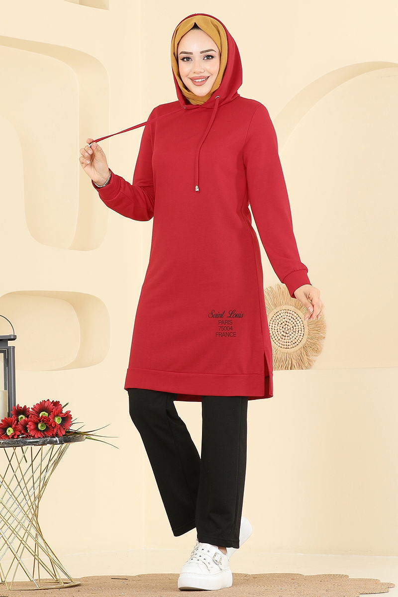 Product Feature : It is a new season hijab fashion product. The neck drawstring is active. The product has a Hooded collar. The tunic has a side slash.. Unlined. The writings are in print. The hood is sewn to the product. The waist of the trousers is elastic. The cuff is rubberized. There may be a tonal difference in the product due to concept photo shoots.