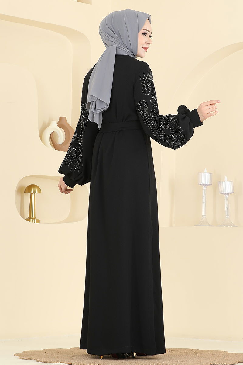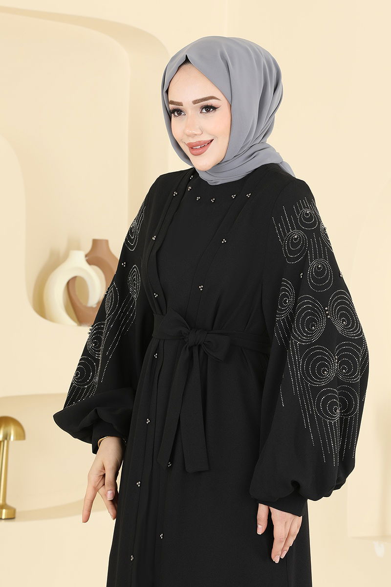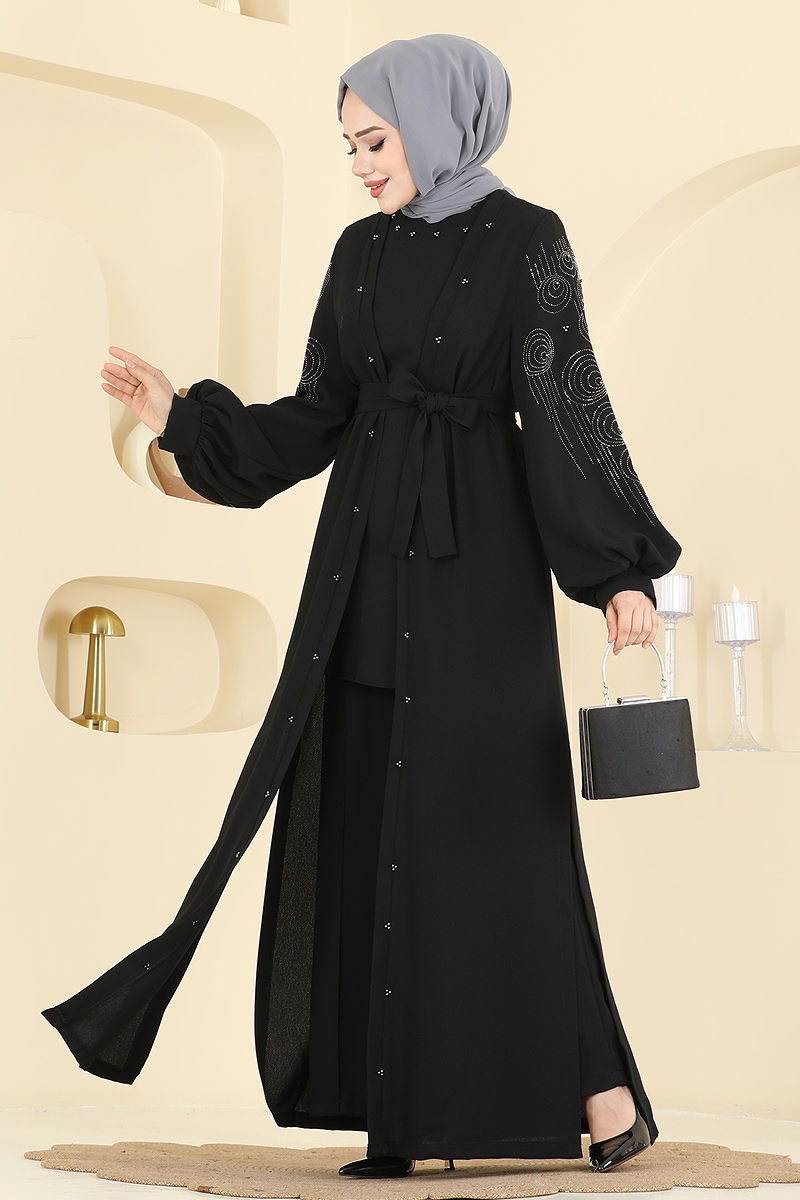 The Stone Detailed Trio Set COMBINATION is a modest wear that can be comfortably worn in all seasons. This set, which needs to be dry cleaned, features a back zipper and a slit design. With a bicycle neck cut and unlined, it's embellished with bead and glued stone details. This ensemble includes a sleeveless inner tunic, elastic waist pants, and a belt. The belt is designed to prevent waviness, with both ends stitched and the middle left unstitched. The belt can be optionally used. With its impressive design, this combination offers both elegance and comfort for your special occasions.