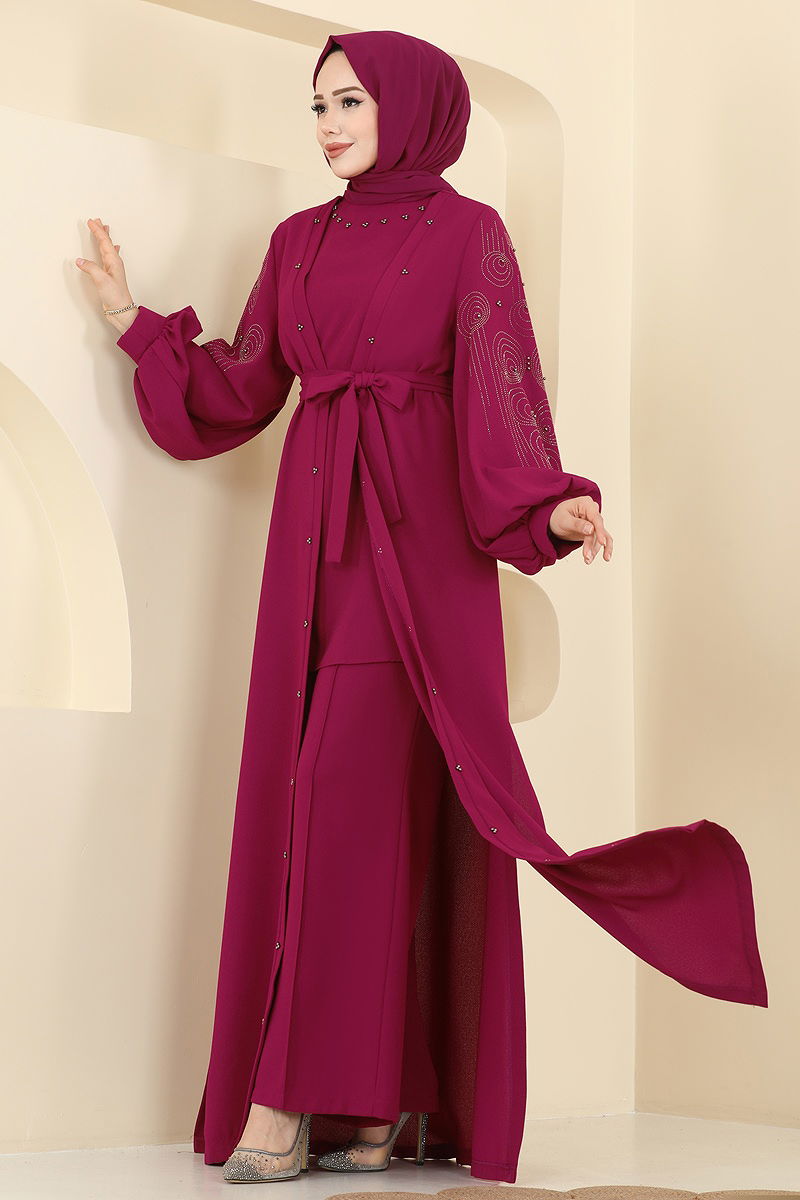 The Stone Detailed Trio Set COMBINATION is a modest wear that can be comfortably worn in all seasons. This set, which needs to be dry cleaned, features a back zipper and a slit design. With a bicycle neck cut and unlined, it's embellished with bead and glued stone details. This ensemble includes a sleeveless inner tunic, elastic waist pants, and a belt. The belt is designed to prevent waviness, with both ends stitched and the middle left unstitched. The belt can be optionally used. With its impressive design, this combination offers both elegance and comfort for your special occasions.