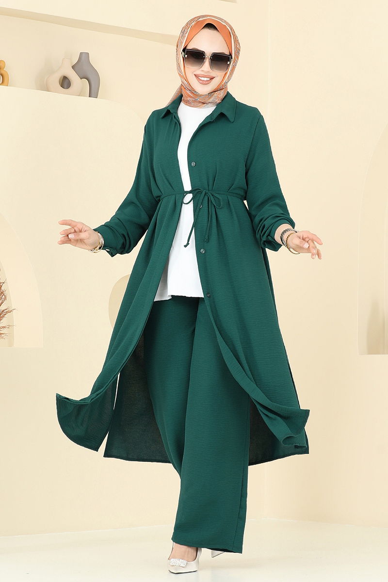 Product Feature : It is a new season hijab fashion product. The product has a Shirt collar. The product has Secret buttons. The tunic has a side slash.. Unlined. Belt included, optional not available. Blouse is not included. Sample combination is made with the blouse to show the intended use of the product. Pocket available. The waist of the trousers is elastic. Cuff buttons are active. There may be a tonal difference in the product due to concept photo shoots.