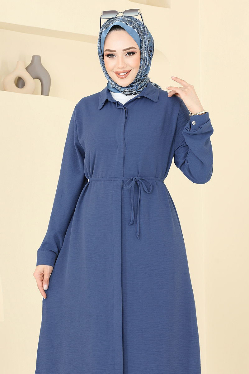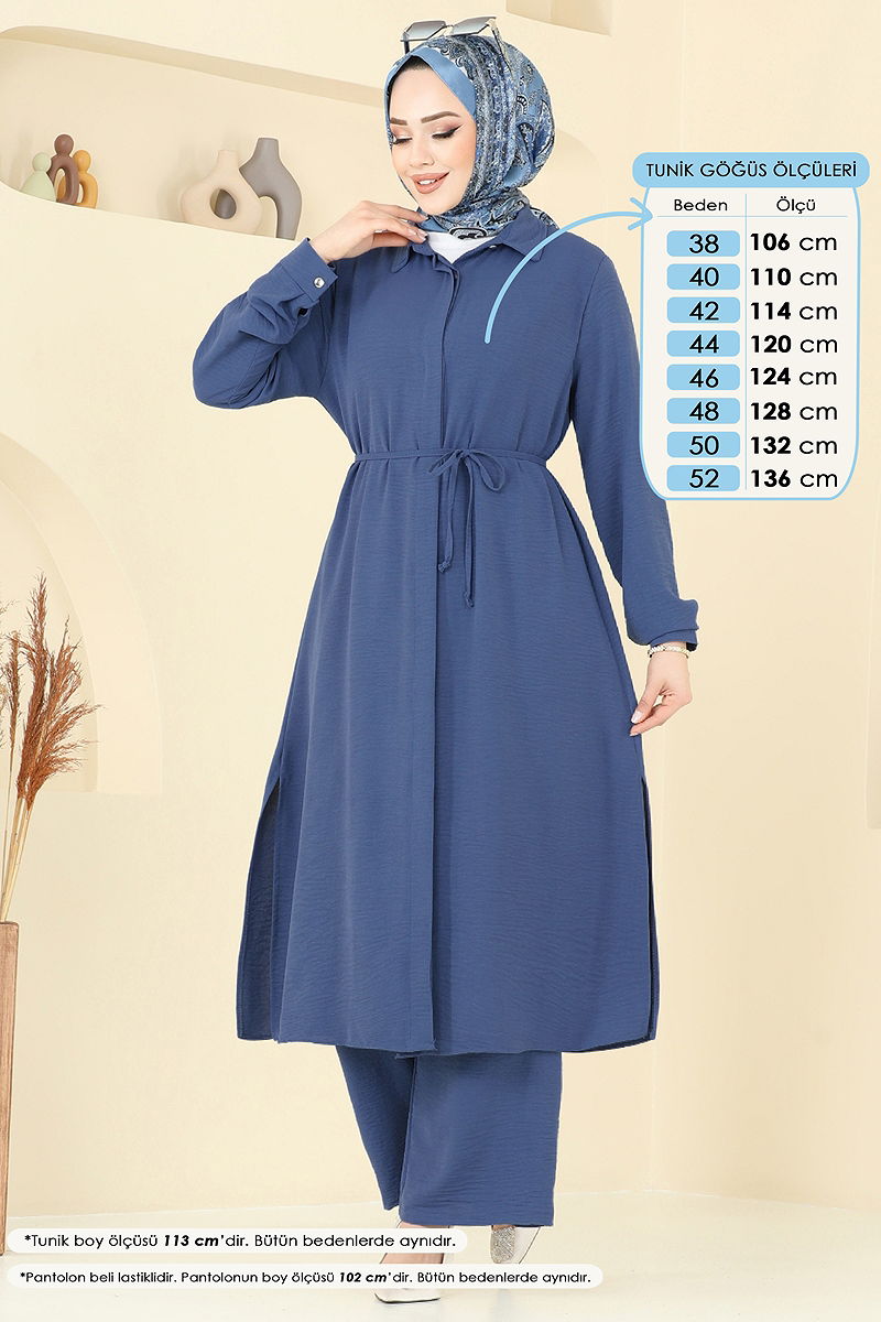 Product Feature : It is a new season hijab fashion product. The product has a Shirt collar. The product has Secret buttons. The tunic has a side slash.. Unlined. Belt included, optional not available. Blouse is not included. Sample combination is made with the blouse to show the intended use of the product. Pocket available. The waist of the trousers is elastic. Cuff buttons are active. There may be a tonal difference in the product due to concept photo shoots.