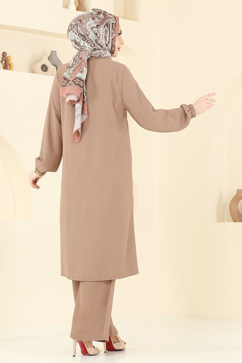Front Buttoned Hijab Suit , made from aerobin fabric, can be comfortably worn in all seasons. It is washable at 30 degrees on a delicate cycle. Its shirt collar and front-buttoned design will complete your elegance. The unlined design provides a light and comfortable fit. This two-piece set, consisting of a tunic and pants, features elastic waistbands and cuffs on the pants, ensuring freedom of movement. The blouse is included as an example combination and is not part of the product. The product displayed on the model is in size 38.