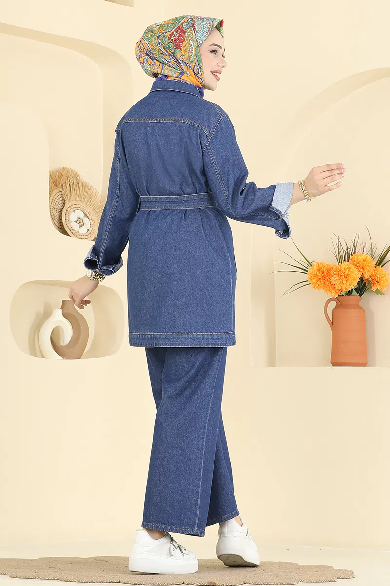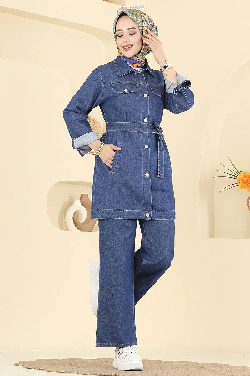 The Belted Denim Suit model, designed for modest dressing, offers comfortable wear for all seasons. It can be washed gently at 30 degrees Celsius. Featuring a shirt collar and front buttons, it ensures a stylish look. This unlined suit is presented in size M. The belt is designed with both ends sewn to prevent wavering, left hollow in the middle; it is included with the suit and its use is optional. The trousers have an elastic waist, and both the jacket and trousers come with pockets and active cuff buttons.