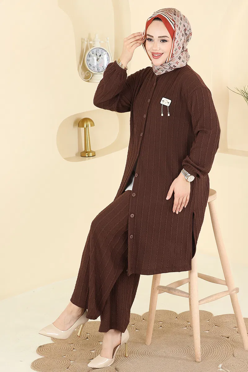 The Twisted Fabric Suit with Patch Details, ideal for those who prefer modest clothing, can be comfortably used in all four seasons. Made from twisted fabric, this suit can be washed at 30 degrees on a gentle cycle for ease of care. Featuring a crew neck and front button design, it offers a modern look. The side slit in the tunic provides freedom of movement, while the elasticated waist and cuffs on the trousers ensure ease of wear. The stitched patch details complete the stylish appearance.
