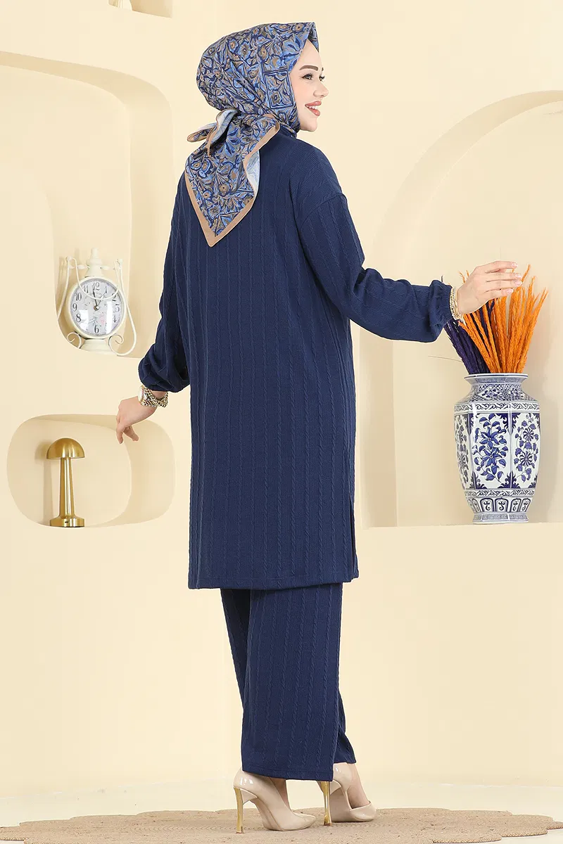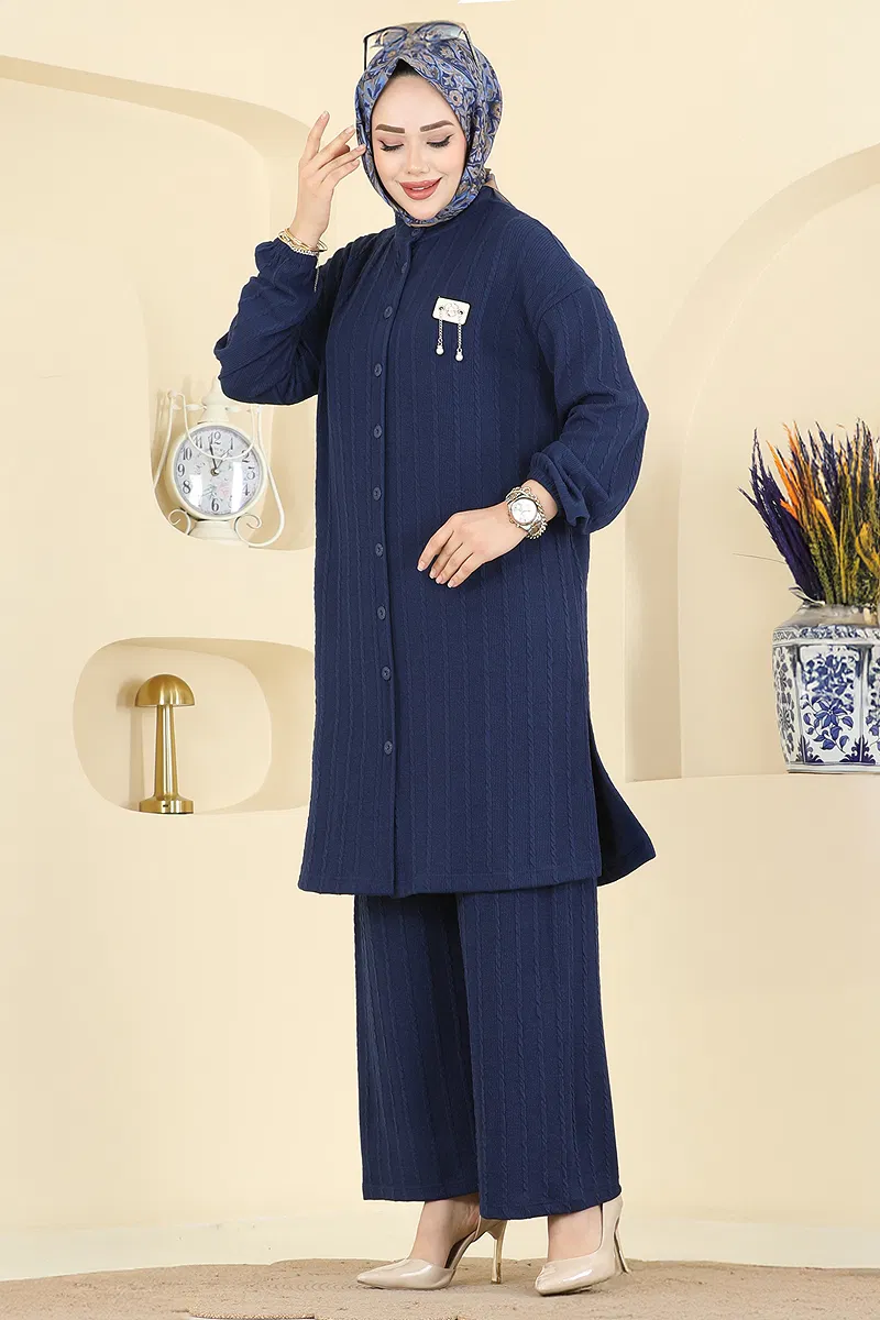 The Twisted Fabric Suit with Patch Details, ideal for those who prefer modest clothing, can be comfortably used in all four seasons. Made from twisted fabric, this suit can be washed at 30 degrees on a gentle cycle for ease of care. Featuring a crew neck and front button design, it offers a modern look. The side slit in the tunic provides freedom of movement, while the elasticated waist and cuffs on the trousers ensure ease of wear. The stitched patch details complete the stylish appearance.