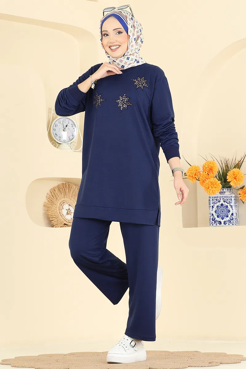 المنتج لديه ياقة دائرية. البلوز تحتوي على فتحة. غير مبطنة. يتم لصق الحجارة. خصر البنطال مرن. قد يكون هناك اختلاف في الدرجة اللونية في المنتج بسبب التقاط الصور الفوتوغرافية.