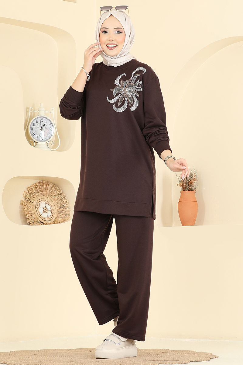 Adorned with floral detailing, the Two Ply Set is a modest wear combination that can be comfortably used across all seasons. This set stands out with its bicycle neckline tunic and side slit details, crafted from two-ply fabric ensuring comfort. The tunic is unlined while the pants have an elastic waistband, offering ease of wear. The stone embellishments add an elegant touch. The product is machine washable at 30 degrees on a gentle cycle. The product displayed is a size Medium.