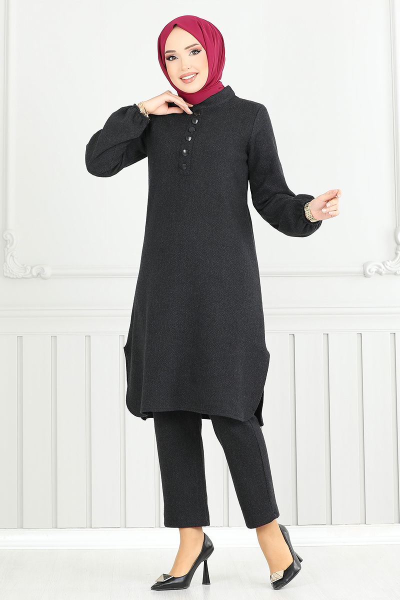 The Accessory-Buttoned Dual Suit is an ideal modest wear for autumn and winter seasons. It can be easily washed with a gentle cycle at 30 degrees Celsius. Made from herringbone fabric, this stylish set features a stand-collar tunic with side slits that catch the eye. This unlined combination offers both comfort and elegance. The product is size 38, and the model's height is 165 cm, bust 80 cm, waist 68 cm, hips 96 cm, weight 54 kg. The tunic has a zipper and a button at the back, while the trousers have elasticated waist and cuffs, providing comfort all day long.