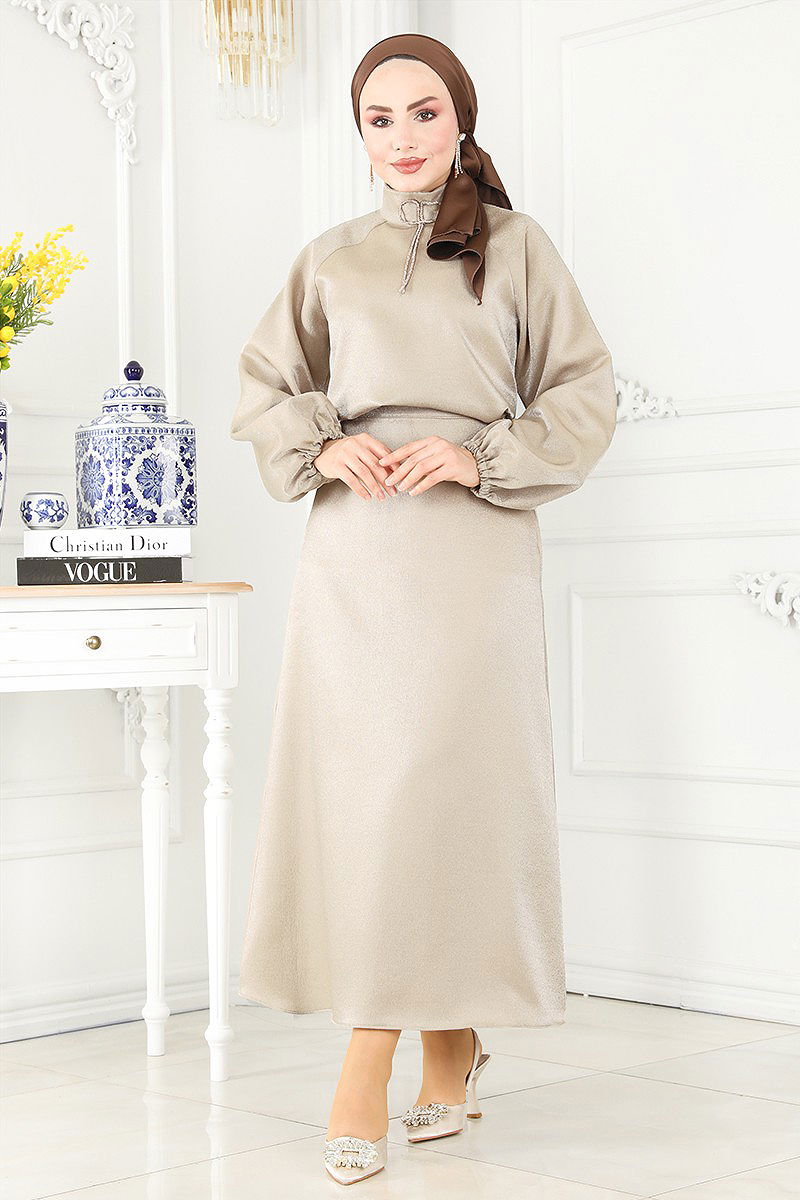 المنتج لديه ياقة نصف بيضوية. غير مبطنة.. المنتج به سحاب في جزء من الخلف. التعليقة متضمنة.يمكن استخدامها حسب الرغبة التنورة تحتوي على سحاب على الخصر قد يكون هناك اختلاف في الدرجة اللونية في المنتج بسبب التقاط الصور الفوتوغرافية.