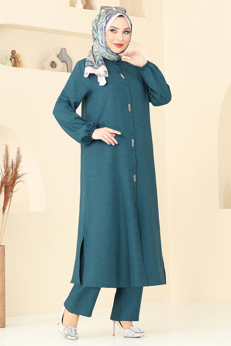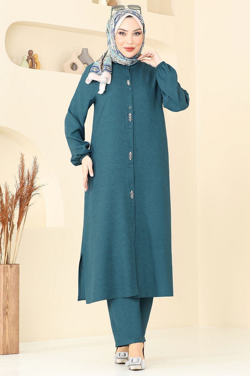 المنتج لديه ياقة القميص. المنتج به أزرار من الأمام. البلوز تحتوي على فتحة. غير مبطنة. التفاصيل الحجرية محفورة. خصر البنطال مرن. السوار مطاطي. قد يكون هناك اختلاف في الدرجة اللونية في المنتج بسبب التقاط الصور الفوتوغرافية.