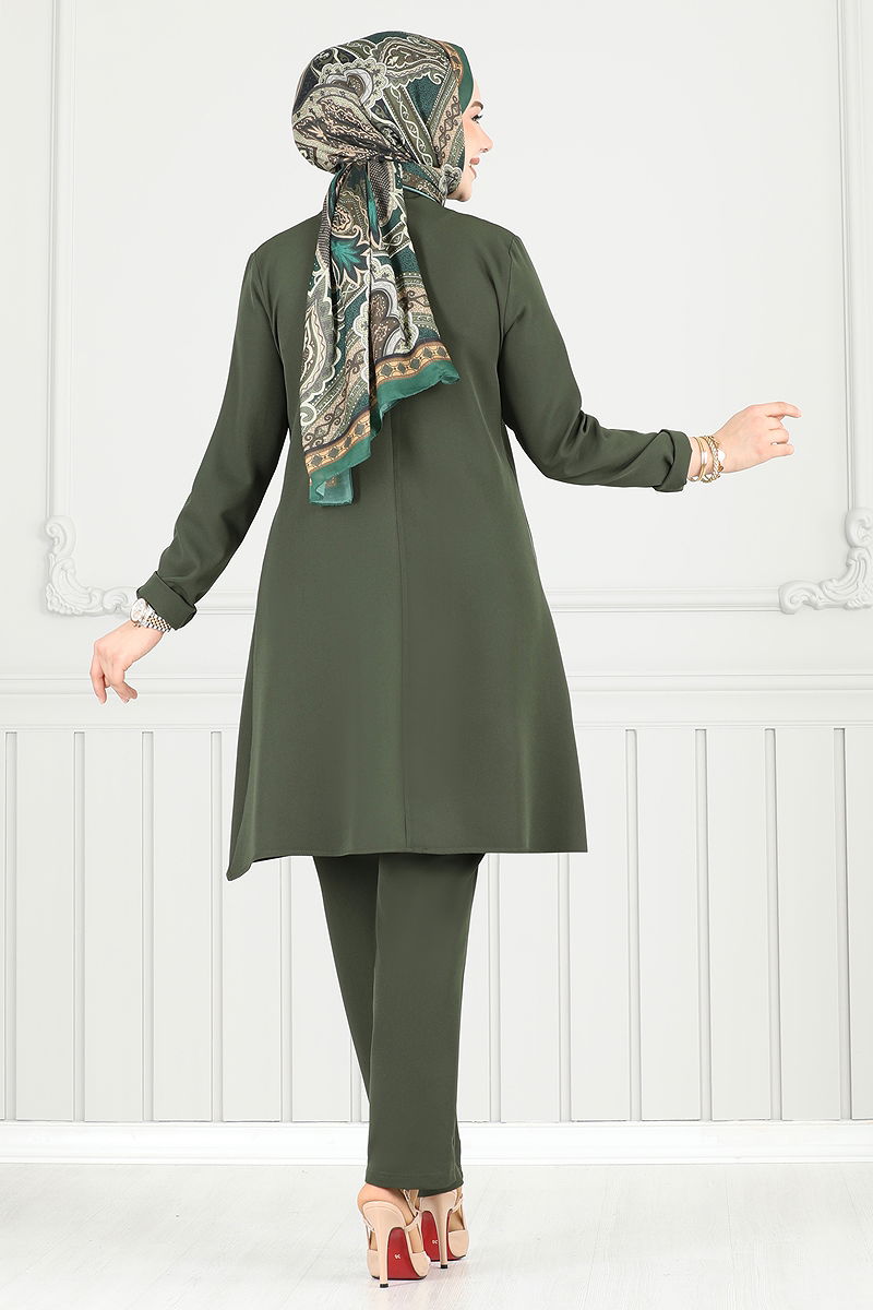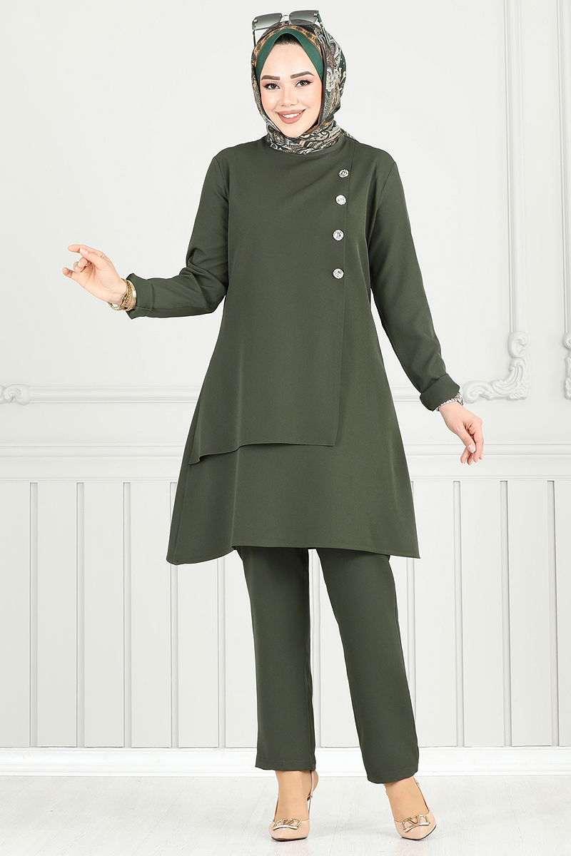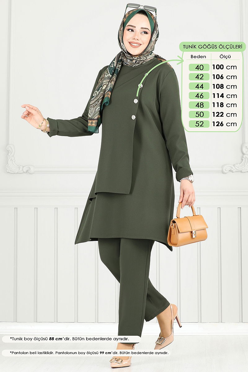The Accessory Buttoned Hijab Suit is a chic option for all seasons. It offers practical use with its feature of being washable at 30 degrees with delicate wash. Made from Dabil fabric, this suit provides comfortable wear with its bicycle collar design and lining-free structure. Its zipper at the back makes it easy to wear and take off. Designed as a tunic and trousers, this model offers a comfortable fit with the elastic at the waist of the trousers. The buttons are added as decorative details only. The product on the model is size 40.