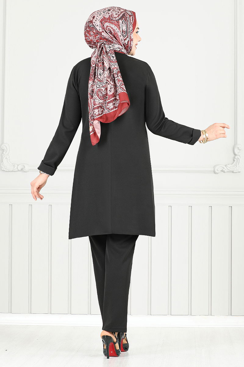 The Button Detail Double Set KOMBİN is a hijab suit model suitable for all seasons. Made from special dabıl fabric, this product stands out with its elegant design. Featuring a bicycle neck and a zipper at the back, it prioritizes comfort and is unlined. The trousers have an elastic waist and, together with the tunic, complete the elegance. The product is suitable for gentle washing at 30 degrees.