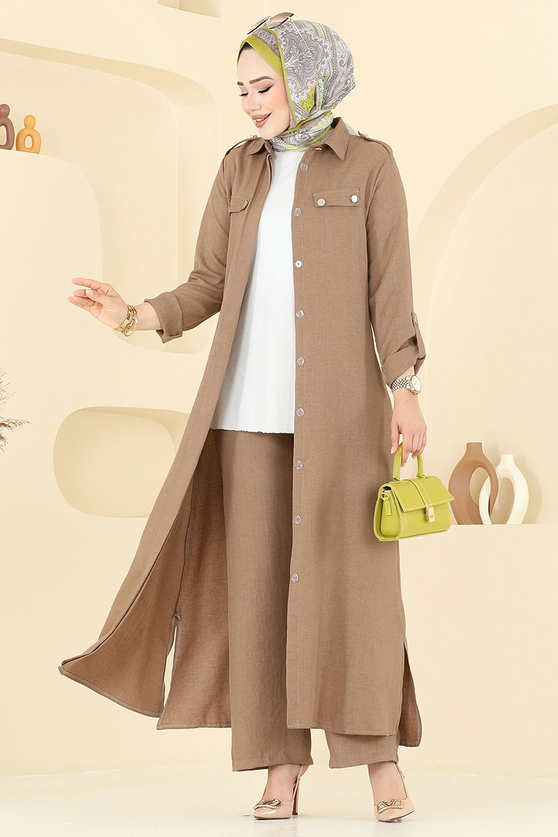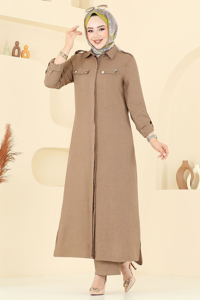 المنتج لديه ياقة القميص. المنتج به أزرار جيزلي. البلوز تحتوي على فتحة. غير مبطنة. الأزرار هي إكسسوارات. البلوزة غير متضمنة. صُنعت عينة من المجموعة مع البلوزة لإظهار الاستخدام المقصود للمنتج. الجيب متاح. خصر البنطال مرن. أزرار الكفة نشطة. قد يكون هناك اختلاف في الدرجة اللونية في المنتج بسبب التقاط الصور الفوتوغرافية.