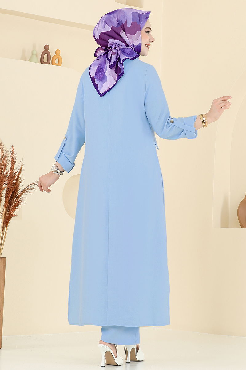 The Sofia Linen Set, model, is a modest attire option suitable for all seasons. Recommended to be washed delicately at 30 degrees Celsius, this set completes your elegance with its shirt collar and hidden buttons. The side-slit tunic and elastic waistband trousers offer comfort, while pockets on both pieces add practical details. The drawstring cuffs elegantly finalize the design. Made of light and breathable Sofia Linen fabric, the outfit ensures comfort throughout the day without lining.