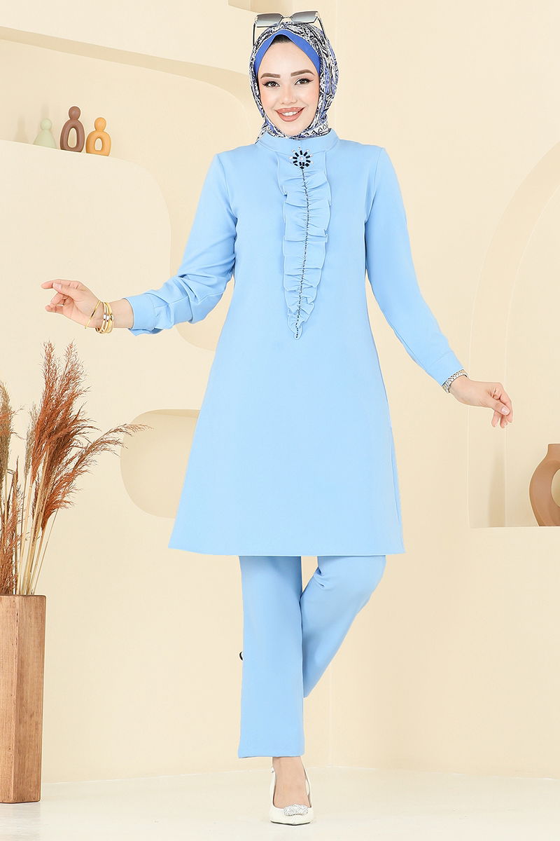 Designed for an elegant and chic look, the Stone Front Chic Suit is a modest wear that can be comfortably used in all seasons. Its delicate structure can be washed at 30 degrees, making it easy to care for. Made from high-quality Dabil fabric, this suit features a mandarin collar, unlined design, and zipper at the back that make it stand out. The active buttons on the cuffs of the tunic and trousers increase usability, while the elastic waist on the trousers ensures comfort. The stone details and stitched accents offer dazzling elegance.