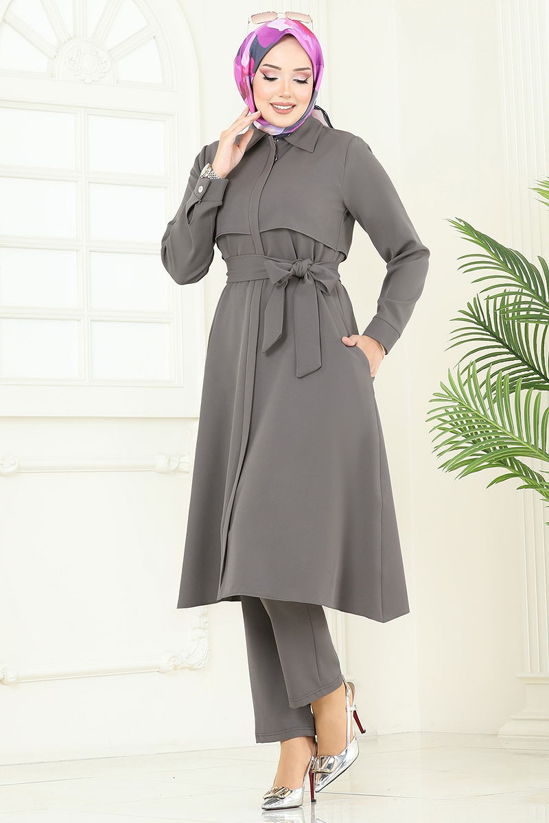 Product Feature : It is a new season hijab fashion product. The product has a Shirt collar. Unlined. The product has a zipper at the From the front part. Belt included, optional not available. Accessories are not included. The waist of the trousers is elastic. Cuff buttons are active. There may be a tonal difference in the product due to concept photo shoots.
