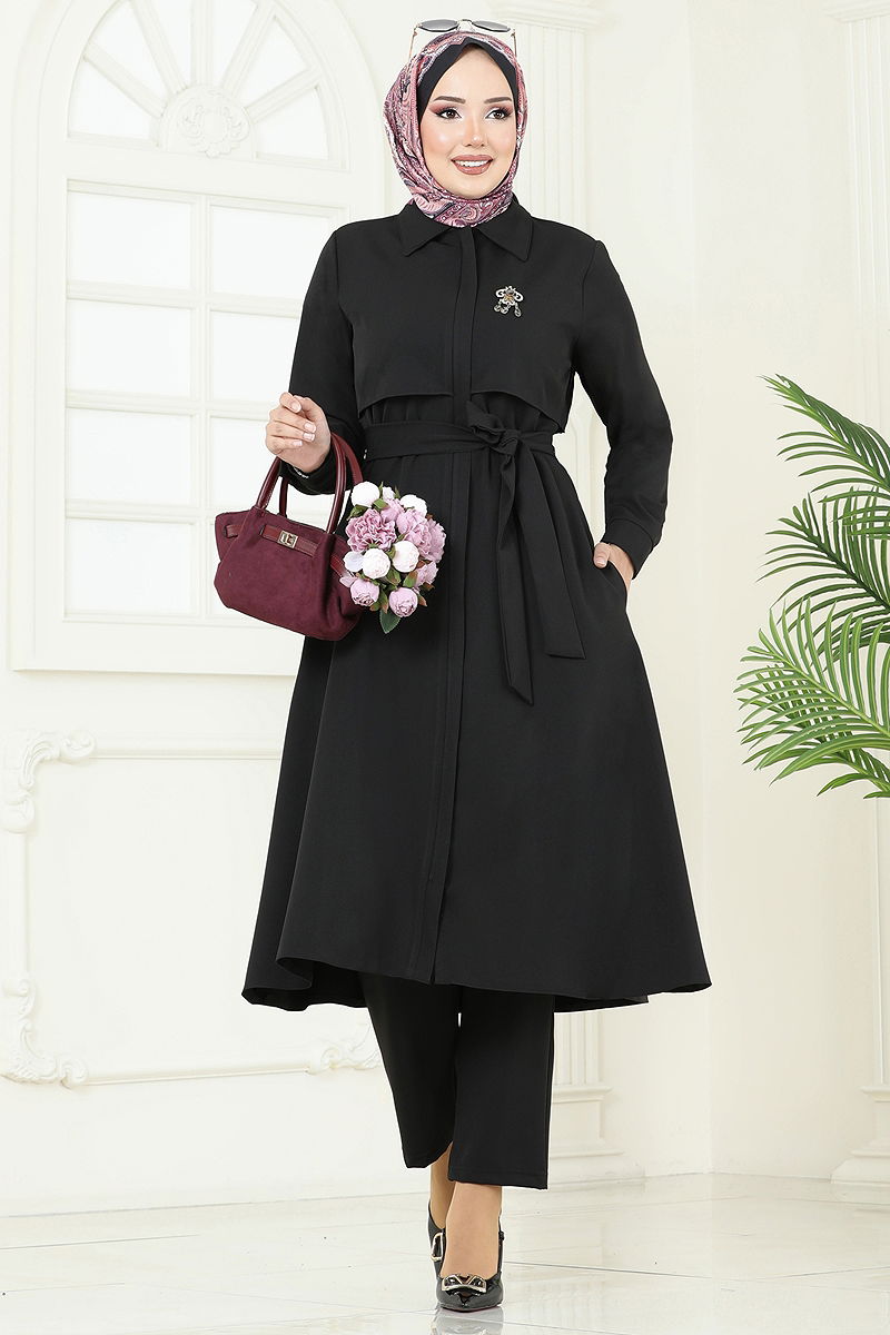 Product Feature : It is a new season hijab fashion product. The product has a Shirt collar. Unlined. The product has a zipper at the From the front part. Belt included, optional not available. Accessories are not included. The waist of the trousers is elastic. Cuff buttons are active. There may be a tonal difference in the product due to concept photo shoots.