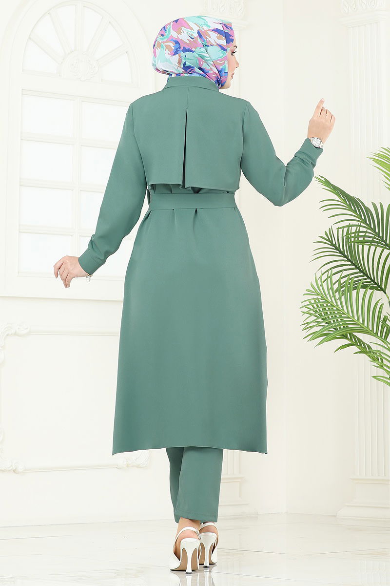 Product Feature : It is a new season hijab fashion product. The product has a Shirt collar. Unlined. The product has a zipper at the From the front part. Belt included, optional not available. Accessories are not included. The waist of the trousers is elastic. Cuff buttons are active. There may be a tonal difference in the product due to concept photo shoots.