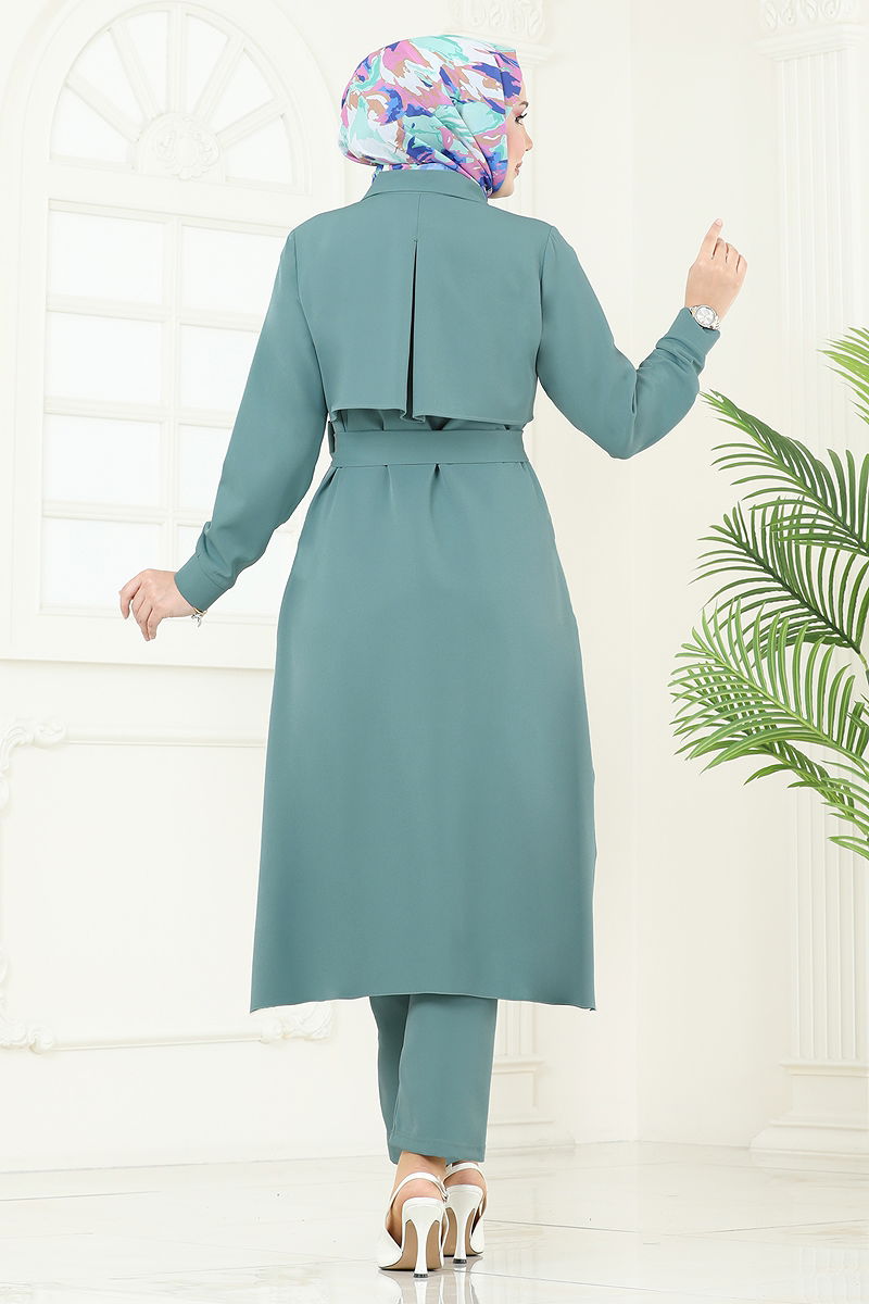 Product Feature : It is a new season hijab fashion product. The product has a Shirt collar. Unlined. The product has a zipper at the From the front part. Belt included, optional not available. Accessories are not included. The waist of the trousers is elastic. Cuff buttons are active. There may be a tonal difference in the product due to concept photo shoots.
