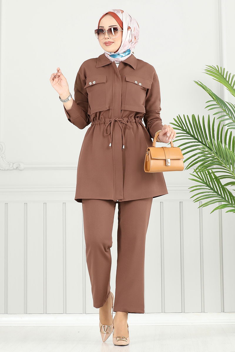 Product Feature : It is a new season hijab fashion product. It has a laced waist. The product has a Shirt collar. Unlined. The product has a zipper at the From the front part. The chest pocket is active. The waist of the trousers is elastic. There may be a tonal difference in the product due to concept photo shoots.