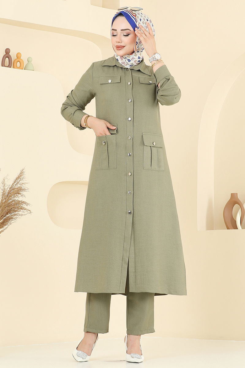 The Pocket-Detailed Sofia Set offers a modern and stylish look with its modest cut. Suitable for all seasons, this set is made from sofia linen fabric. Its shirt collar design and front buttoned structure provide practical use. Side slits on the tunic offer freedom of movement, while the elastic waist on the pants increases comfort. Pockets in both the tunic and pants add useful details. Active buttons on the cuffs complete the elegance. The product can be washed at 30 degrees on a gentle cycle.