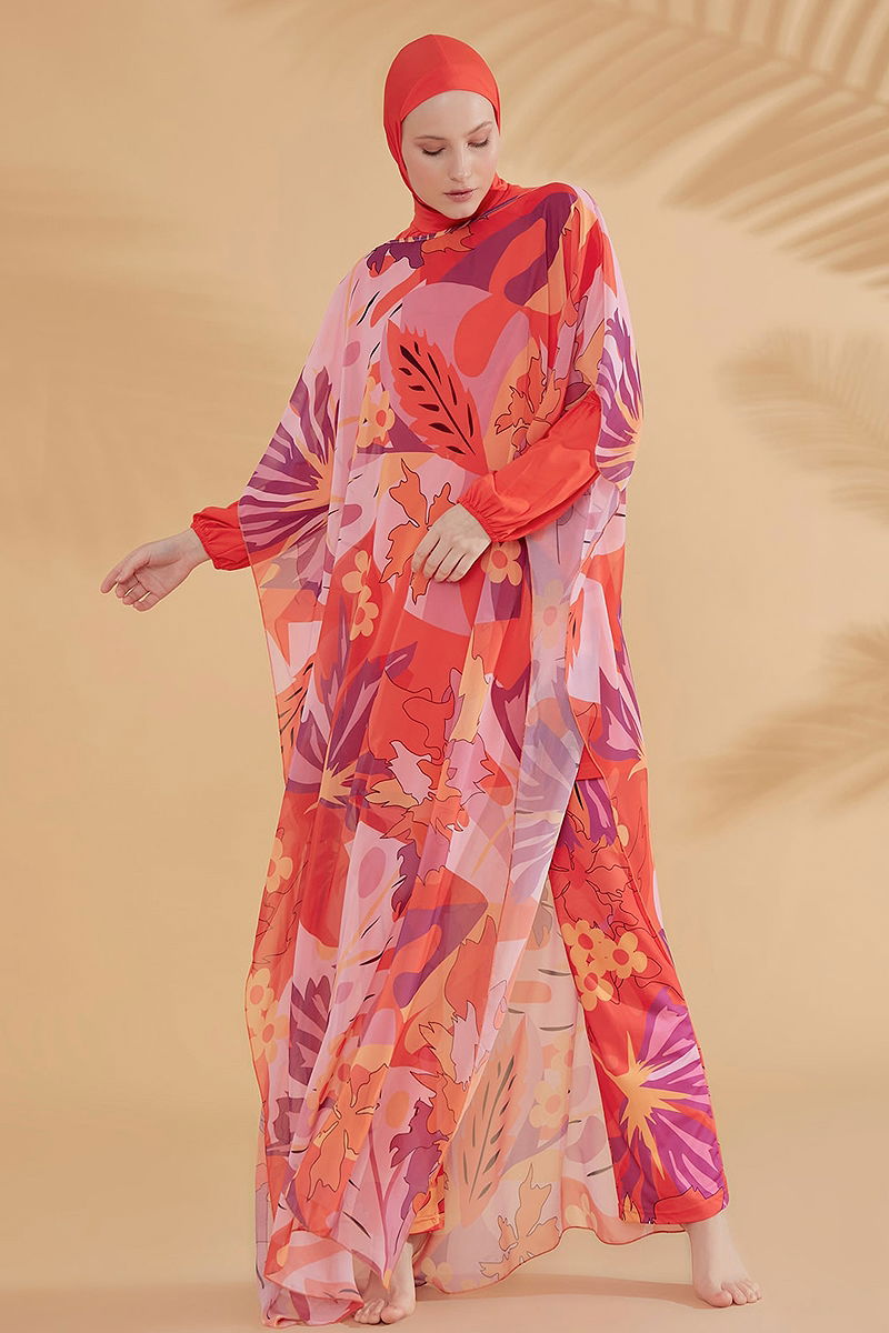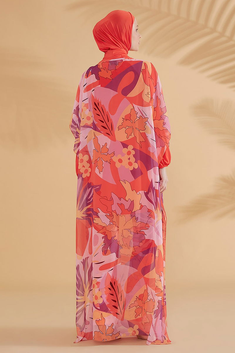 Our Floral Colorful Pareo model is an ideal modest wear option, especially for the summer months. Made from light and breathable chiffon fabric, it features a bicycle neck and a slit detail, offering both comfort and elegance without lining. Suitable for standard sizes from 36 to 48, this pareo offers both style and comfort in one piece. Measurements: Length: 178 cm, Chest: 83 cm, Waist: 60 cm, Hip: 90 cm.
