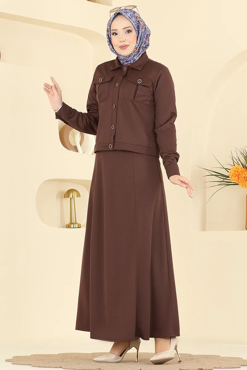 Featuring an innovative design, the Pocket Detailed Dress Suit COMBINE is crafted with your comfort in mind for all seasons. Made from delicate crepe fabric, this modest wear can be washed at 30 degrees, offering both practicality and style. With a shirt collar and front buttons, it enhances your elegance, while the sleeveless inner dress and unlined jacket provide a modern and chic look. The breast pocket detail and cuff buttons add functionality.