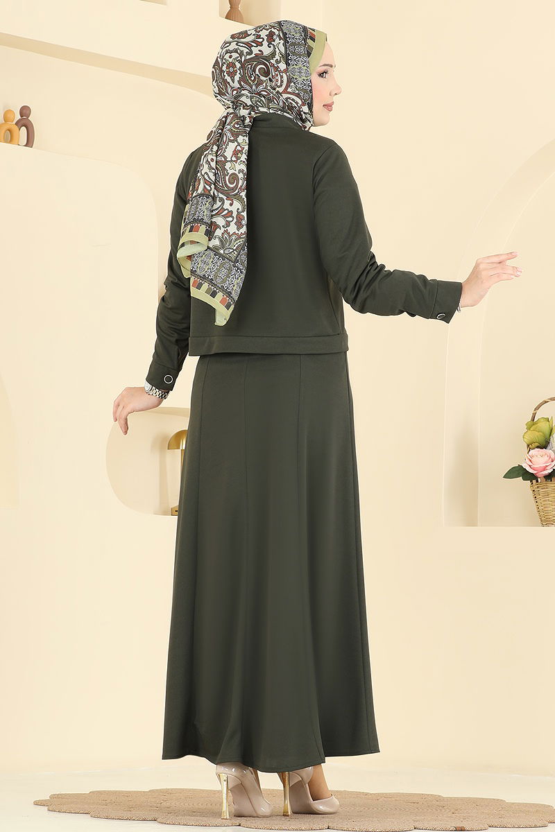 Featuring an innovative design, the Pocket Detailed Dress Suit COMBINE is crafted with your comfort in mind for all seasons. Made from delicate crepe fabric, this modest wear can be washed at 30 degrees, offering both practicality and style. With a shirt collar and front buttons, it enhances your elegance, while the sleeveless inner dress and unlined jacket provide a modern and chic look. The breast pocket detail and cuff buttons add functionality.