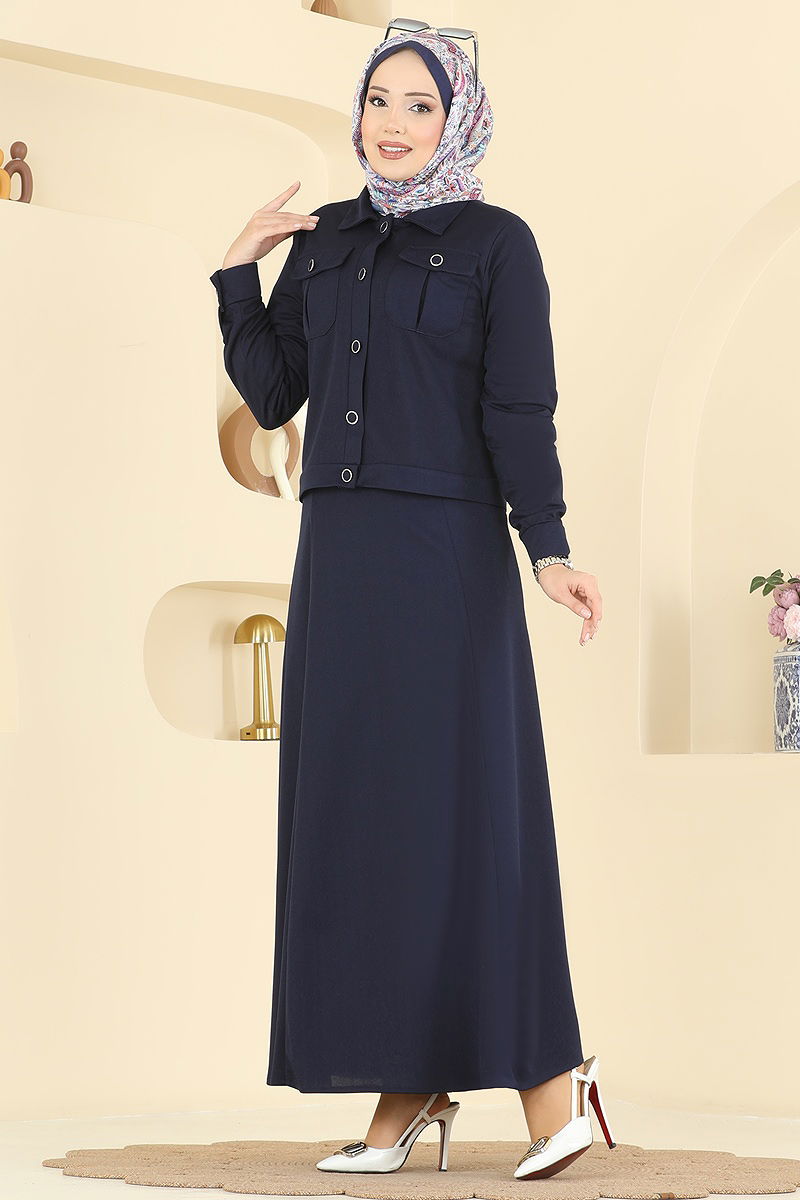 Featuring an innovative design, the Pocket Detailed Dress Suit COMBINE is crafted with your comfort in mind for all seasons. Made from delicate crepe fabric, this modest wear can be washed at 30 degrees, offering both practicality and style. With a shirt collar and front buttons, it enhances your elegance, while the sleeveless inner dress and unlined jacket provide a modern and chic look. The breast pocket detail and cuff buttons add functionality.