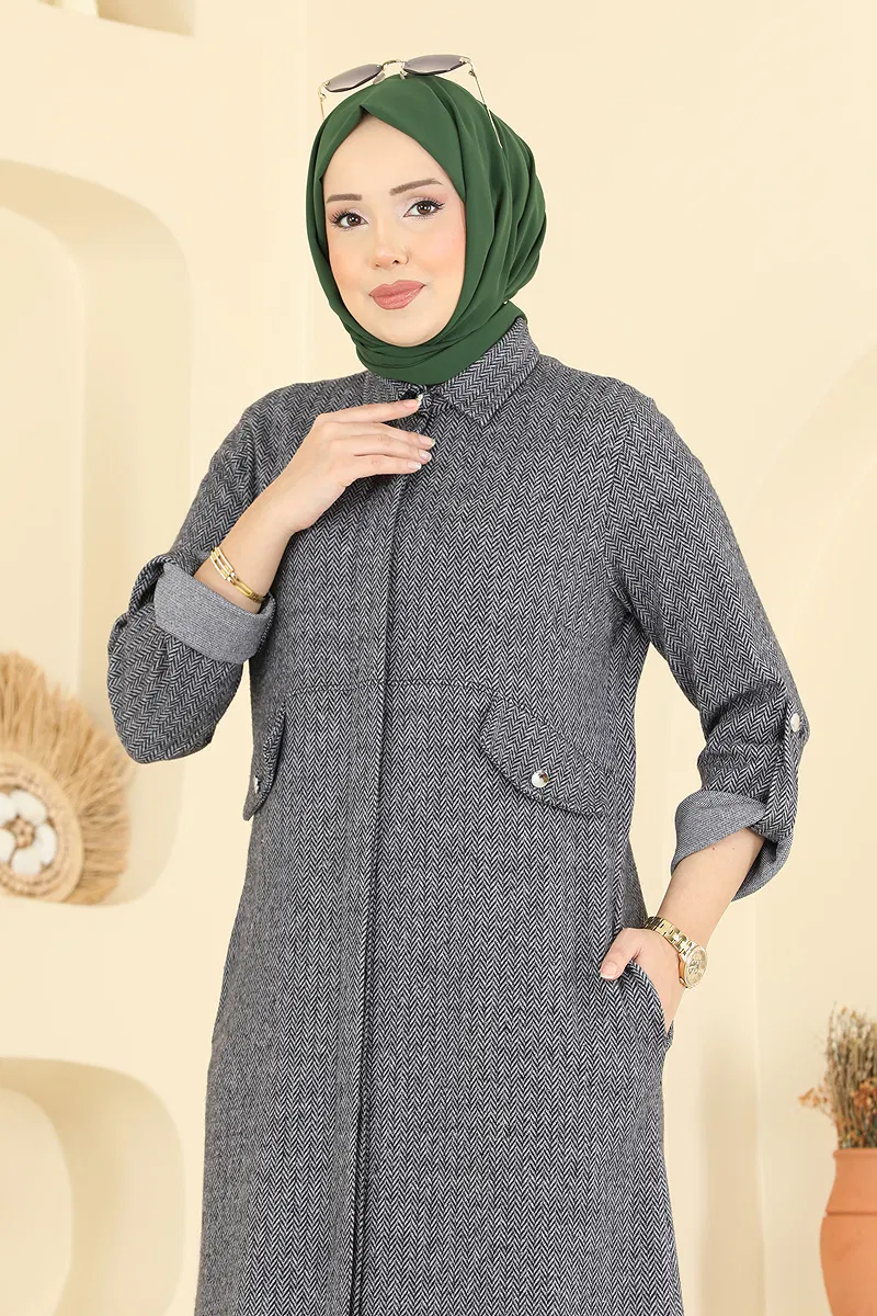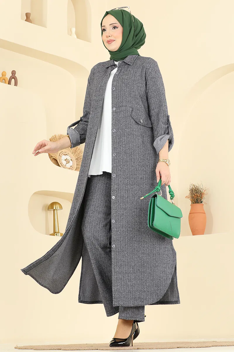 The Herringbone Suit with Pocket Detail is an ideal modest wear for the autumn and winter seasons. Made from herringbone patterned fabric, this suit offers both style and comfort. It features a light structure, shirt collar, and hidden buttons. The tunic includes side slits and hidden pockets, enhancing its functionality, with stitched waist and an elastic waistband on the trousers. The cuffs have active epaulette buttons and the pocket details are decorative. This item requires gentle washing and can be cleaned at 30 degrees Celsius.