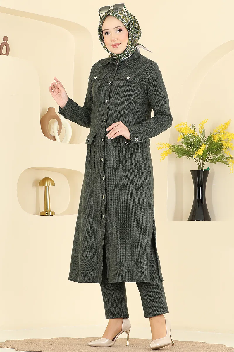 The Buttoned Herringbone Suit is an ideal choice for autumn and winter. Made from delicate herringbone fabric, this modest suit offers both style and comfort. It features a shirt-style collar and a front button design for practical use. The side-slit tunic and elastic waist pants promise both comfort and elegance. With a breast pocket detail for a stylish look, this set can be washed at 30 degrees on a gentle cycle.