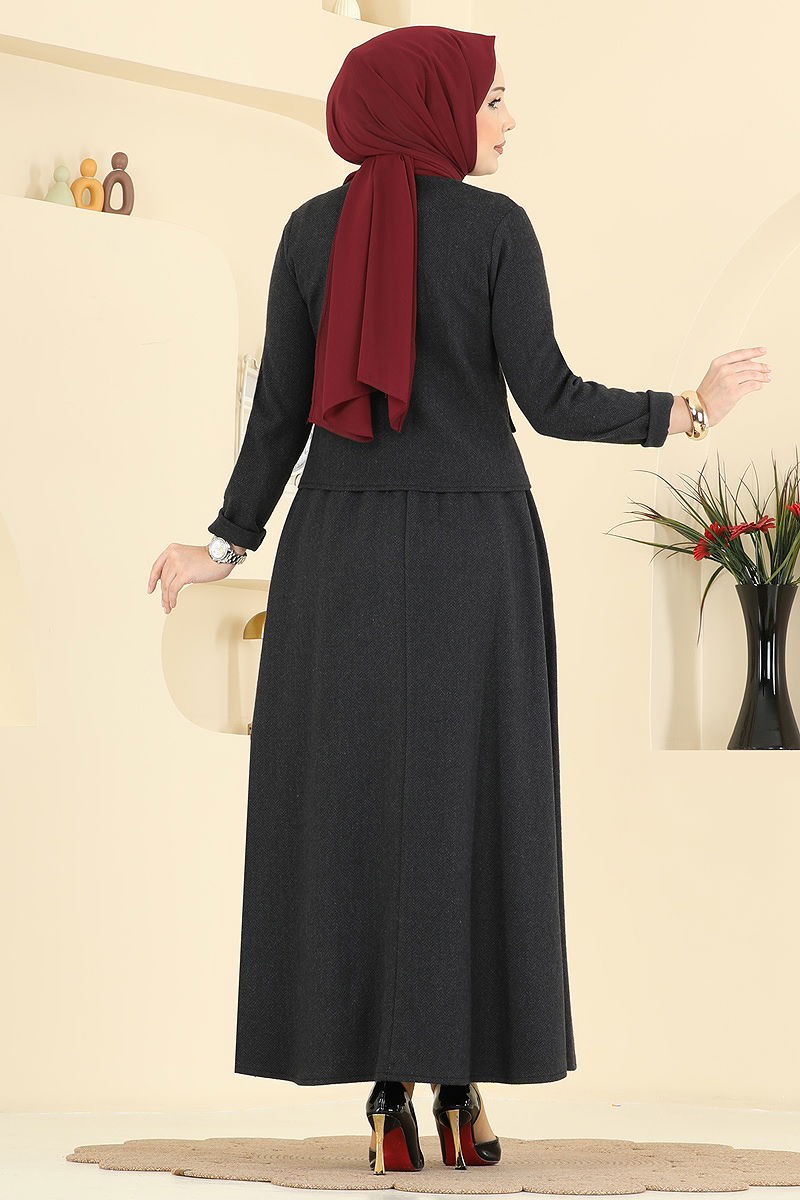 The Herringbone Textured Two-Piece Suit is a modest apparel that combines original style and comfort. Suitable for both professional and everyday wear, this suit can be comfortably worn in all seasons and is washable at 30 degrees on a gentle cycle. With its elegant upright collar and front button details, the suit also features an elastic-waisted skirt for comfortable wear. Practical and stylish, it represents you in the best way possible in every situation.