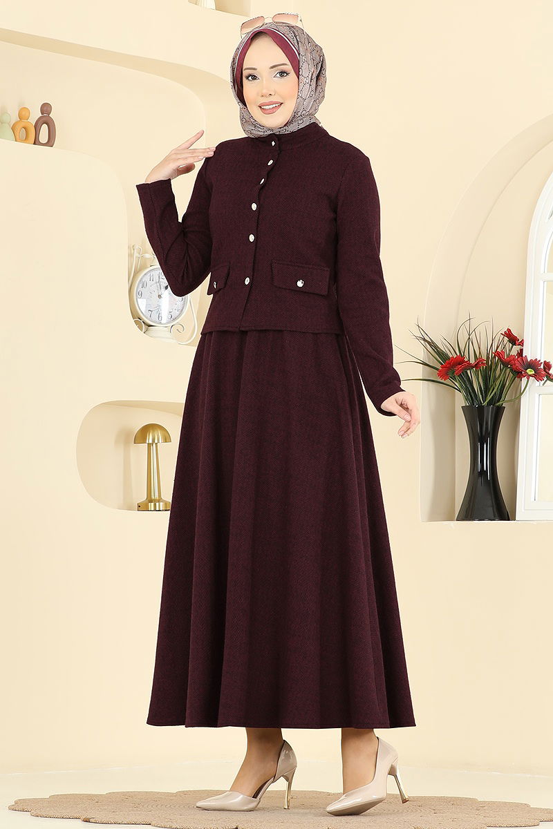 The Herringbone Textured Two-Piece Suit is a modest apparel that combines original style and comfort. Suitable for both professional and everyday wear, this suit can be comfortably worn in all seasons and is washable at 30 degrees on a gentle cycle. With its elegant upright collar and front button details, the suit also features an elastic-waisted skirt for comfortable wear. Practical and stylish, it represents you in the best way possible in every situation.