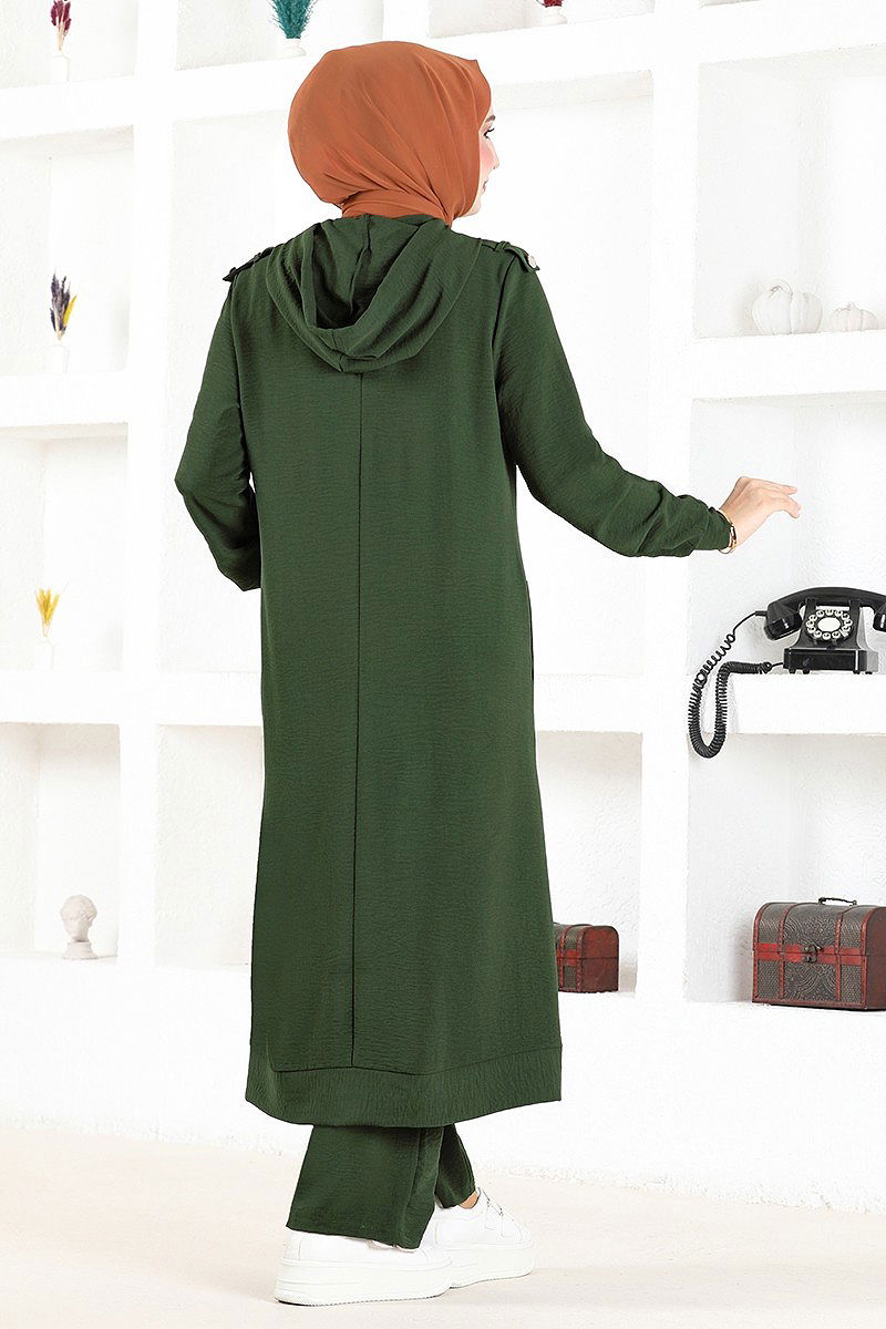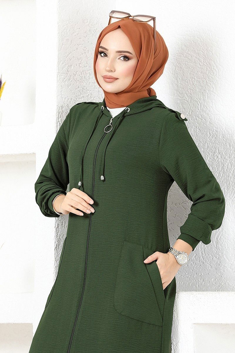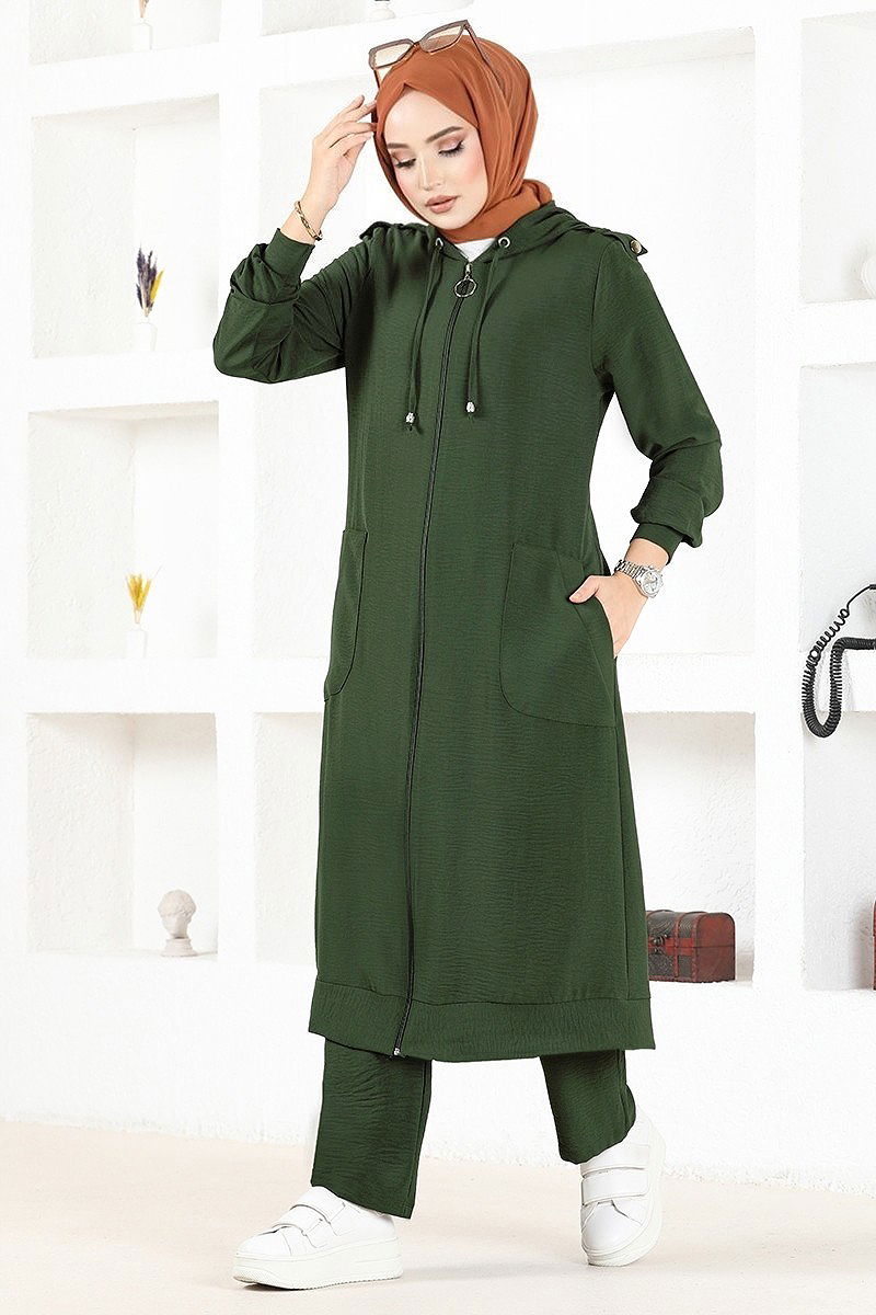 Product Feature : It is a new season hijab fashion product. Unlined.. The product has a zipper at the From the front part. The hood is sewn to the product. Pocket available. Pants have elastic waist. There may be a tonal difference in the product due to concept photo shoots.