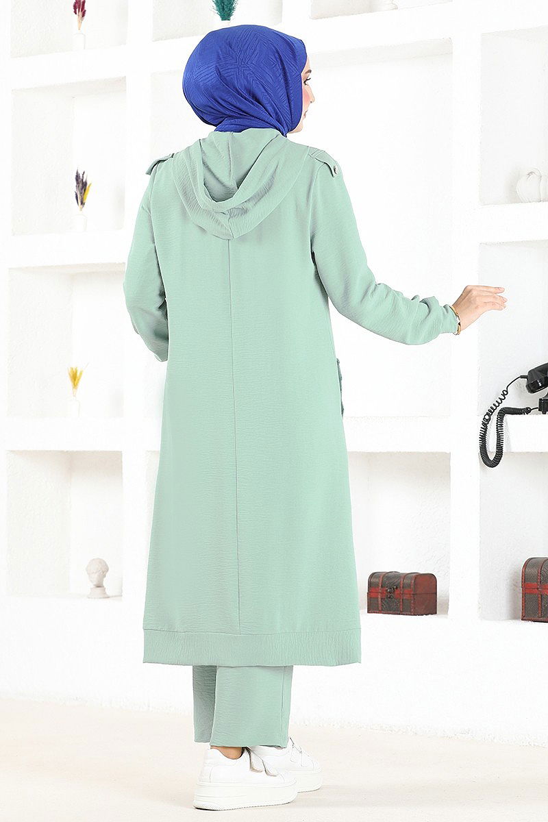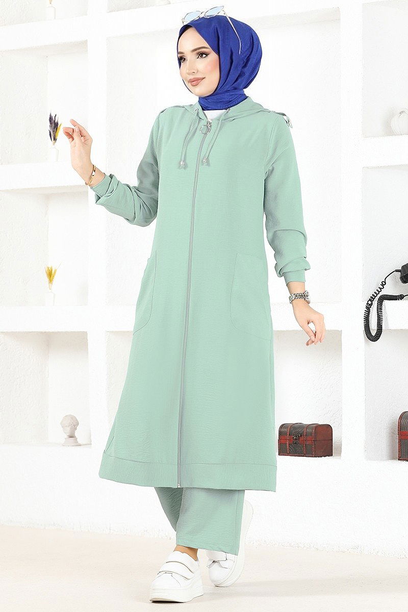 Product Feature : It is a new season hijab fashion product. Unlined.. The product has a zipper at the From the front part. The hood is sewn to the product. Pocket available. Pants have elastic waist. There may be a tonal difference in the product due to concept photo shoots.