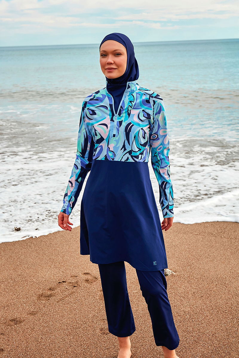 The Patterned Full Coverage Swimsuit model is specifically designed for modest swimwear. Ideal for Spring and Summer, this swimsuit is made from parachute fabric and is unlined. It should be hand washed, and due to its water repellent properties, it dries quickly after you get out of the water without sticking to your body. It features a convenient front zipper and an elasticated bottom for a perfect fit.