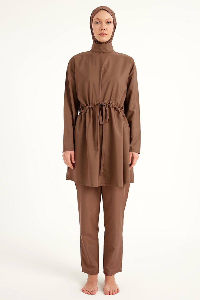 Coverage Swimsuit is the summer essential for modest women, offering both style and comfort with its model. Made from parachute fabric, it is lightweight and durable. Its water-repellent feature allows it to dry quickly, ensuring it does not stick to your body after swimming. The fully covered design provides maximum protection. The product comprises three parts: top swimsuit, bottom swimsuit, and a swim cap. Hand washing is recommended.