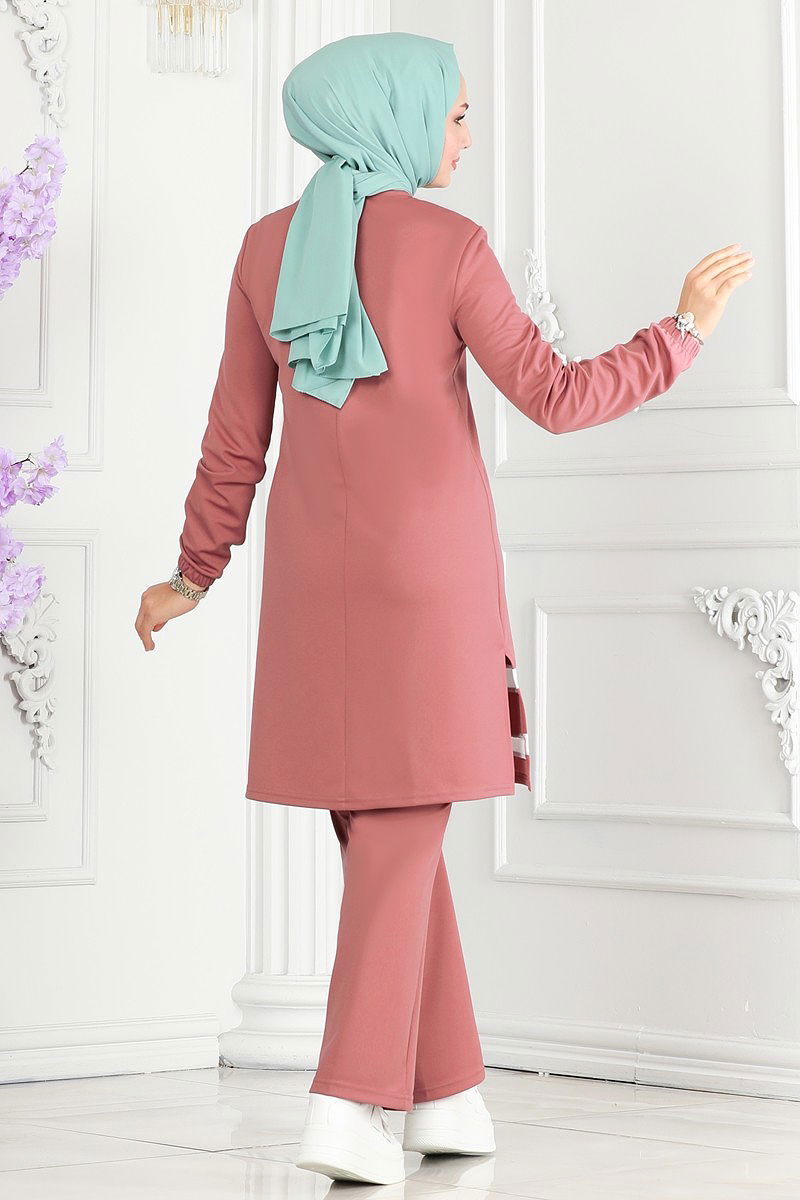 The innovative and modern Manchetted Bias Set KOMBİN offers a combination of comfort and elegance in modest fashion. Suitable for all seasons, this outfit is crafted from special knit Dabil fabric and can be washed at 30 degrees with gentle care. The design features a bicycle neck tunic with side slits and elasticated cuffs, paired with an elasticated waist trouser. Together, the tunic and trousers present an elegant appearance without requiring a lining. Standard size measurements for the model (size 38): Height 165 cm, chest 80 cm, waist 68 cm, hips 96 cm, weight 54 kg.