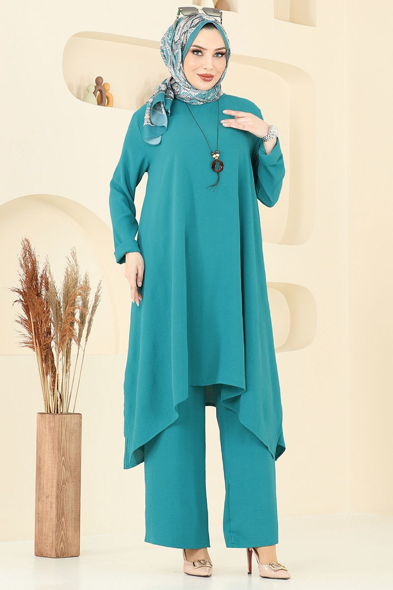 Embrace elegance with our Asymmetric Cut Necklace Set, a perfect blend of modesty and modern fashion. This outfit can be easily worn in all seasons, thanks to its versatile design made from aerobin fabric, ensuring comfort all day long. It can be gently washed at 30 degrees with delicate care. The tunic features a side slit and a bicycle neckline, adding a touch of contemporary style. The included necklace serves as a stylish accessory, optionally removable. With an elastic waistband, the trousers offer comfort throughout the day. This set combines both elegance and comfort, quickly becoming a favorite in your wardrobe.