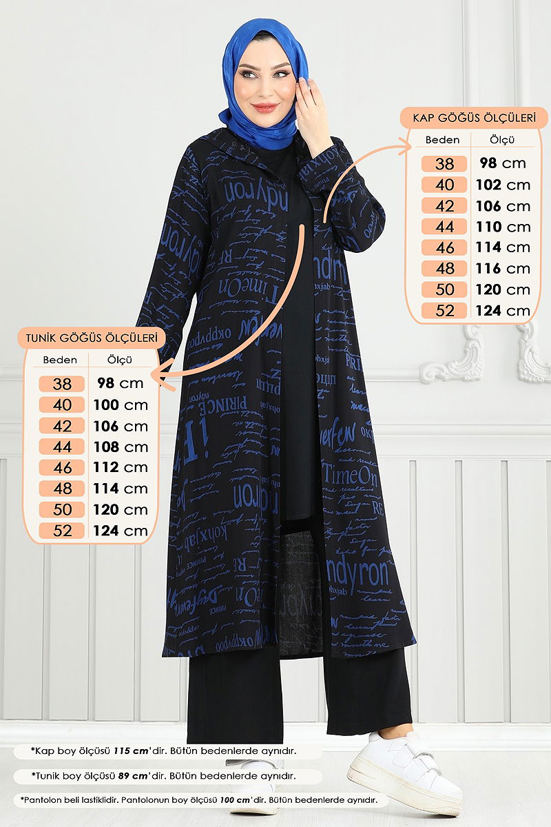 Product Feature : It is a new season hijab fashion product. It has a button that can be used from the back. The product has a Cycling collar. Unlined. The writings are in print. The inner tunic is sleeveless. The hood is sewn to the product. The waist of the trousers is elastic. There may be a tonal difference in the product due to concept photo shoots.