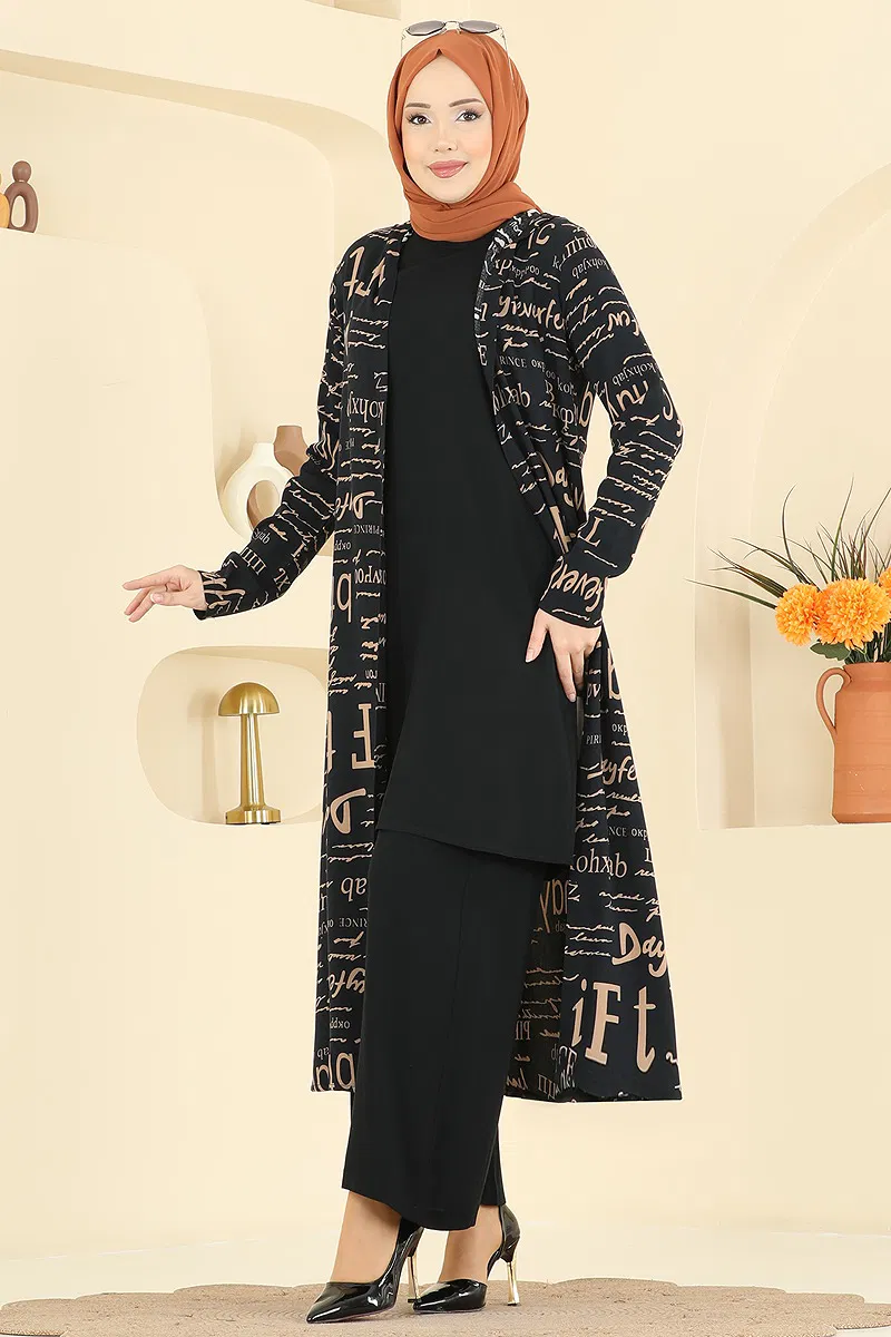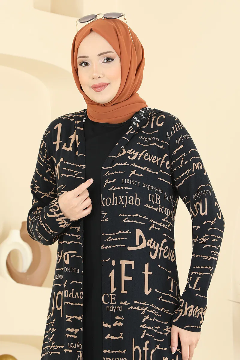 With its chic and modern design, the Printed Text Triple Set is an ideal choice for your modest outfits. Suitable for all seasons, this product offers the convenience of washing at 30 degrees on a gentle cycle. Made from viscose fabric, this set is designed with your comfort in mind. It features a crew neckline and is unlined to keep it light. The elastic waistband on the pants, along with a tunic and cape, completes this elegant ensemble, which will fit like a size 38 and speak volumes about your style with its printed texts.