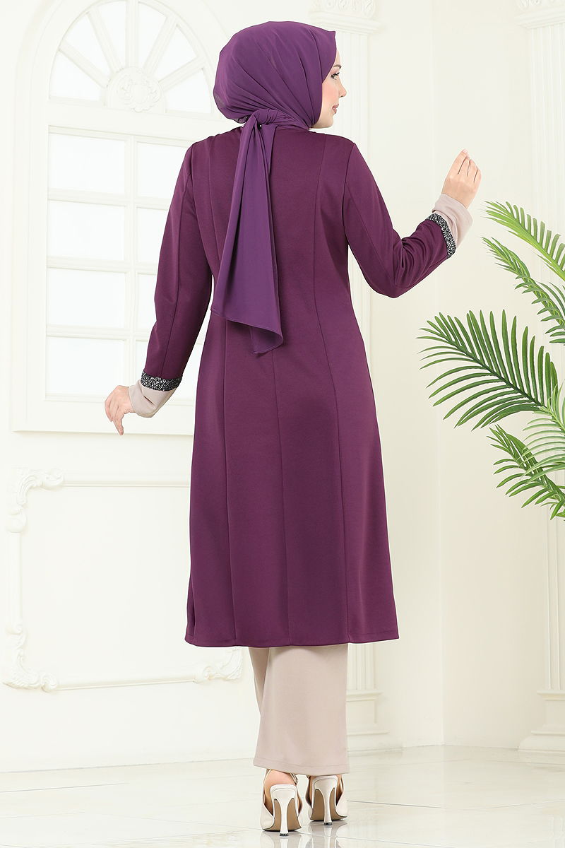 Product Feature : It is a new season hijab fashion product. The product has a Cycling collar. Unlined. The product has a zipper at the from the back part. The inner tunic is sewn to the product. Scales are sewn on. The waist of the trousers is elastic. There may be a tonal difference in the product due to concept photo shoots.