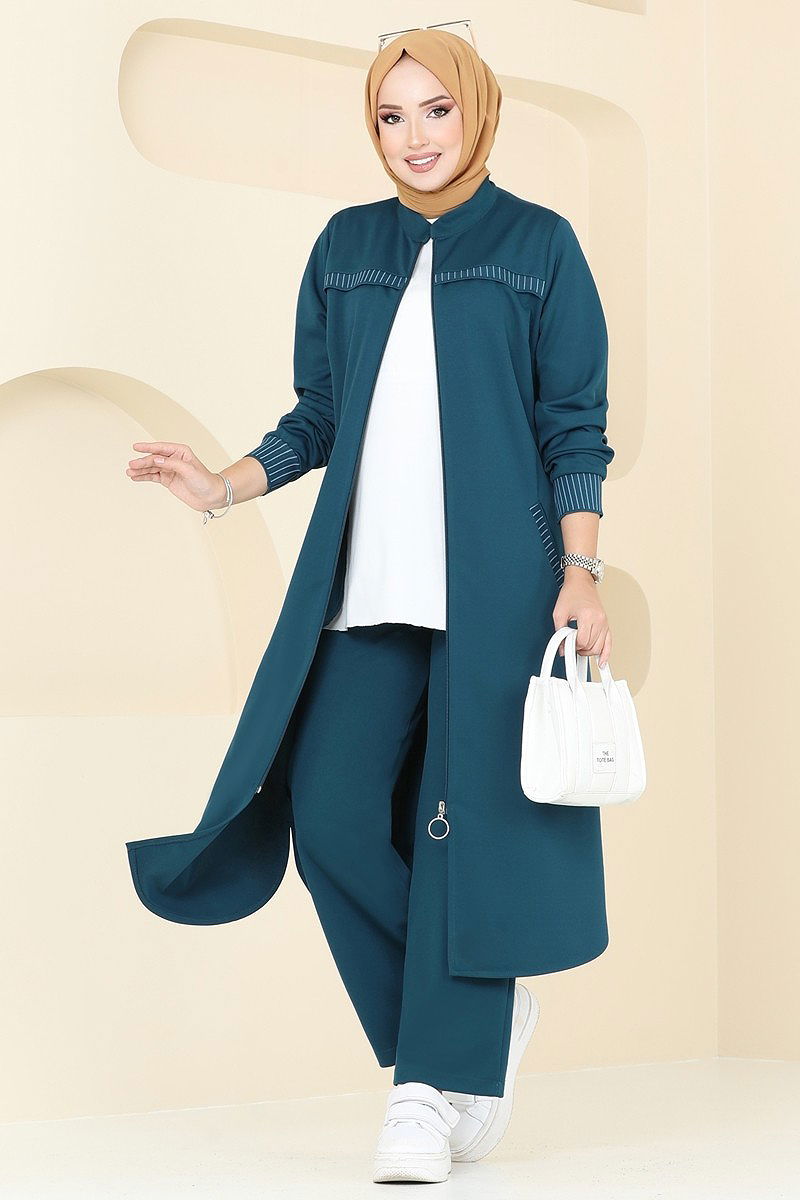 Front Zipper Embellished Set model hijab product for the Autumn and Winter seasons. It can be washed at 30 DEGREES WITHOUT SQUEEZING. (GENTLE WASH) It is made of Knitted Dabıl fabric. The product has a Half Dominant collar and is unlined. The product is front zippered. (The product on the model is size 40.) Height: 165 cm, Chest: 80 cm, Waist: 68 cm, Hip: 96 cm, Weight: 54 kg. The pants waist is elastic. pockets available.