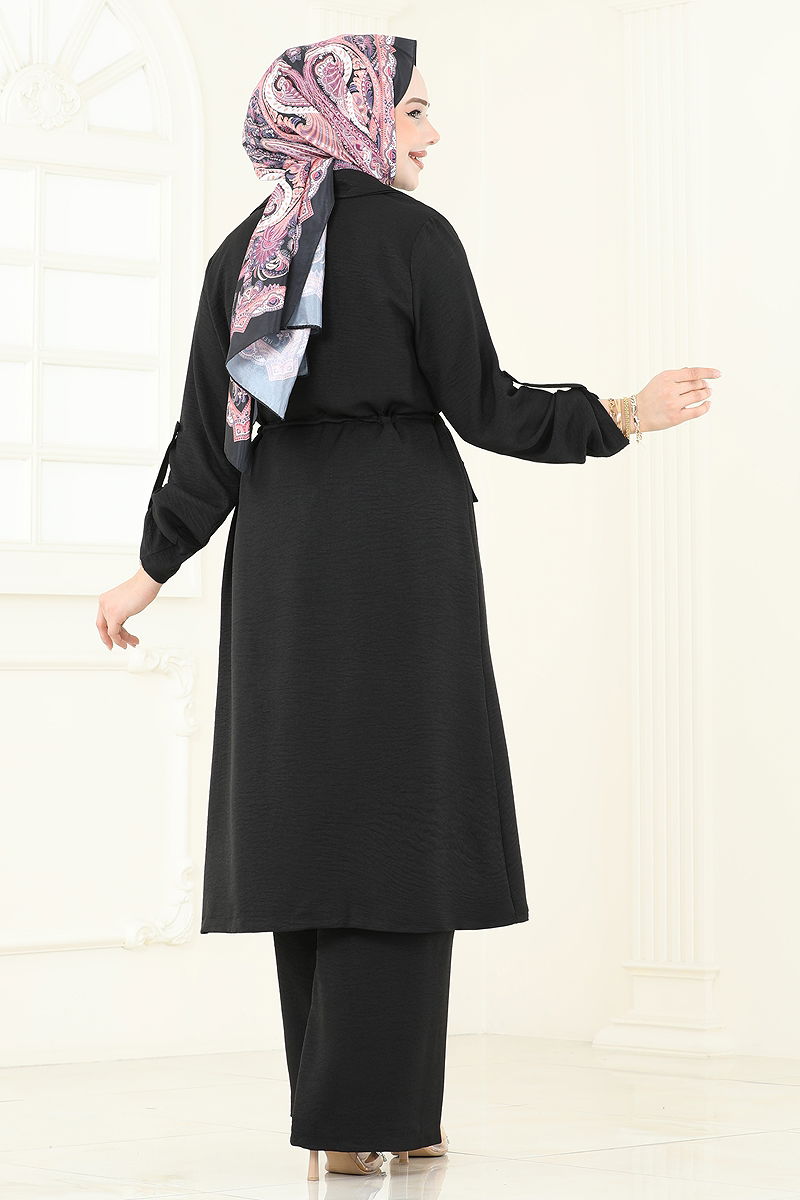 The Crossover Neck Hijab Suit is a stylish combination that can be comfortably used in all seasons. Made from Sofia Linen fabric, this product is suitable for gentle washing at 30 degrees. Its crossover neckline and unlined design prioritize comfort. With a tie-up waist and elastic waist pants, this set offers both a chic and practical usage. Pocket details and active cuff buttons make it ideal for those who pay attention to details.