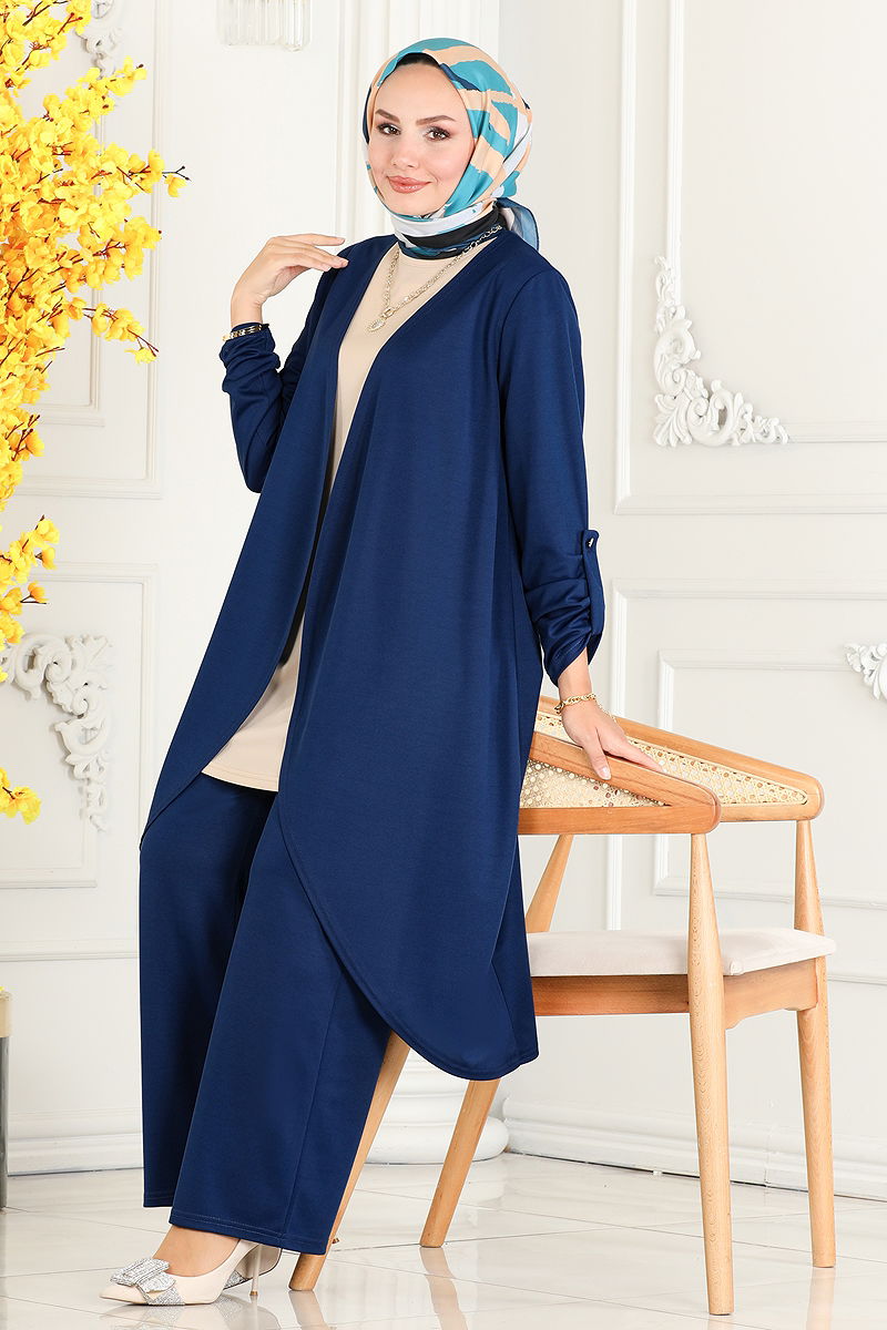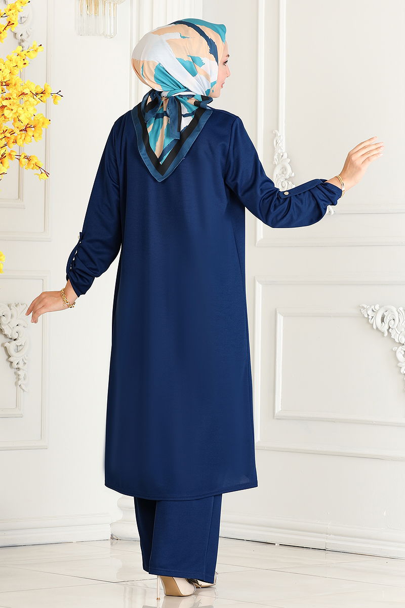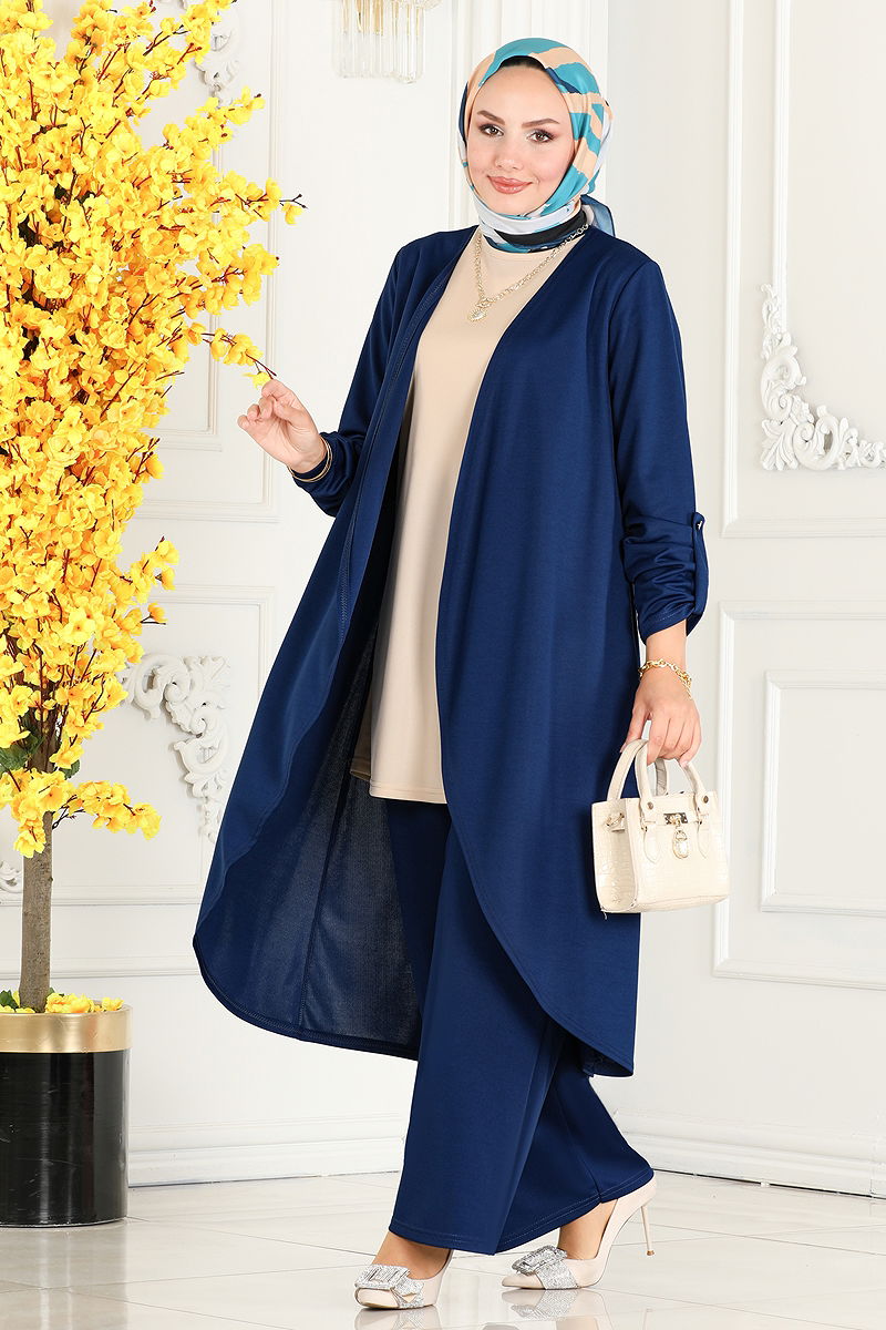 Product Feature:It is a new season hijab fashion product. (It is unlined.) It has a bicycle collar. There is a button that can be used from the back. Accessories are not included in the product. Cuff buttons are active. The trouser waist is elastic. The inner tunic is sleeveless. There may be a tonal difference in the product color due to concept shots.