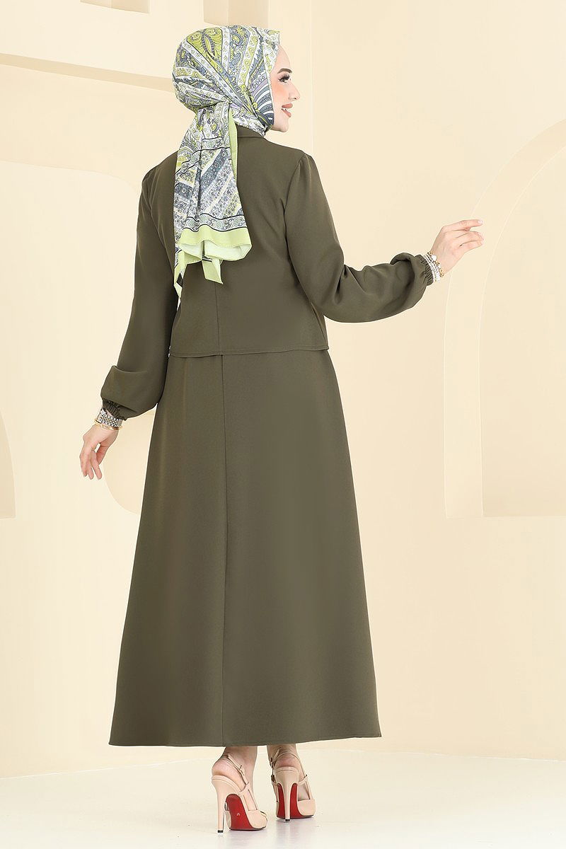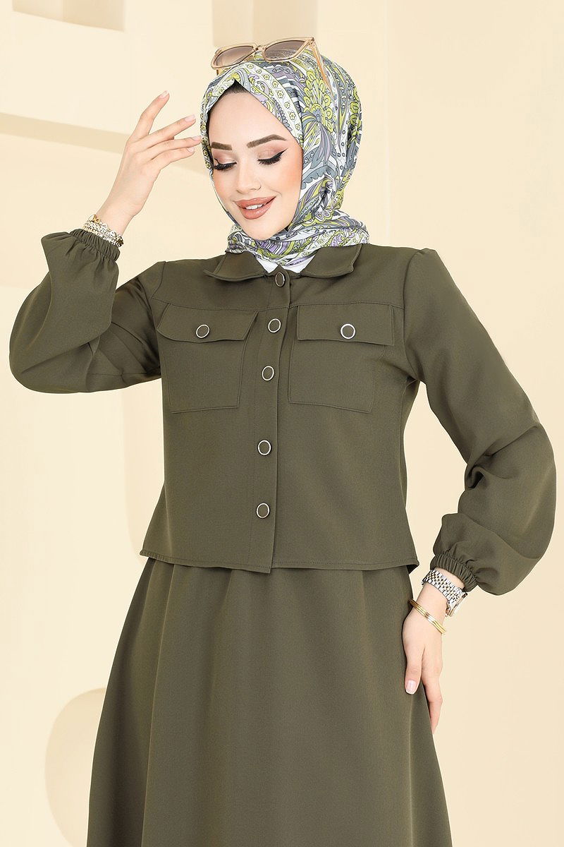 Product Feature : It is a new season hijab fashion product. The product has a Shirt collar. The product has From the front buttons. Unlined. Belt is not included. Shirt is not included. Sample combination is made with the shirt to show the intended use of the product. The chest pocket is active. The skirt waist is elastic. The cuff is rubberized. There may be a tonal difference in the product due to concept photo shoots.