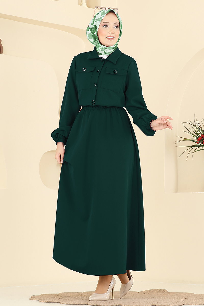 Product Feature : It is a new season hijab fashion product. The product has a Shirt collar. The product has From the front buttons. Unlined. Belt is not included. Shirt is not included. Sample combination is made with the shirt to show the intended use of the product. The chest pocket is active. The skirt waist is elastic. The cuff is rubberized. There may be a tonal difference in the product due to concept photo shoots.