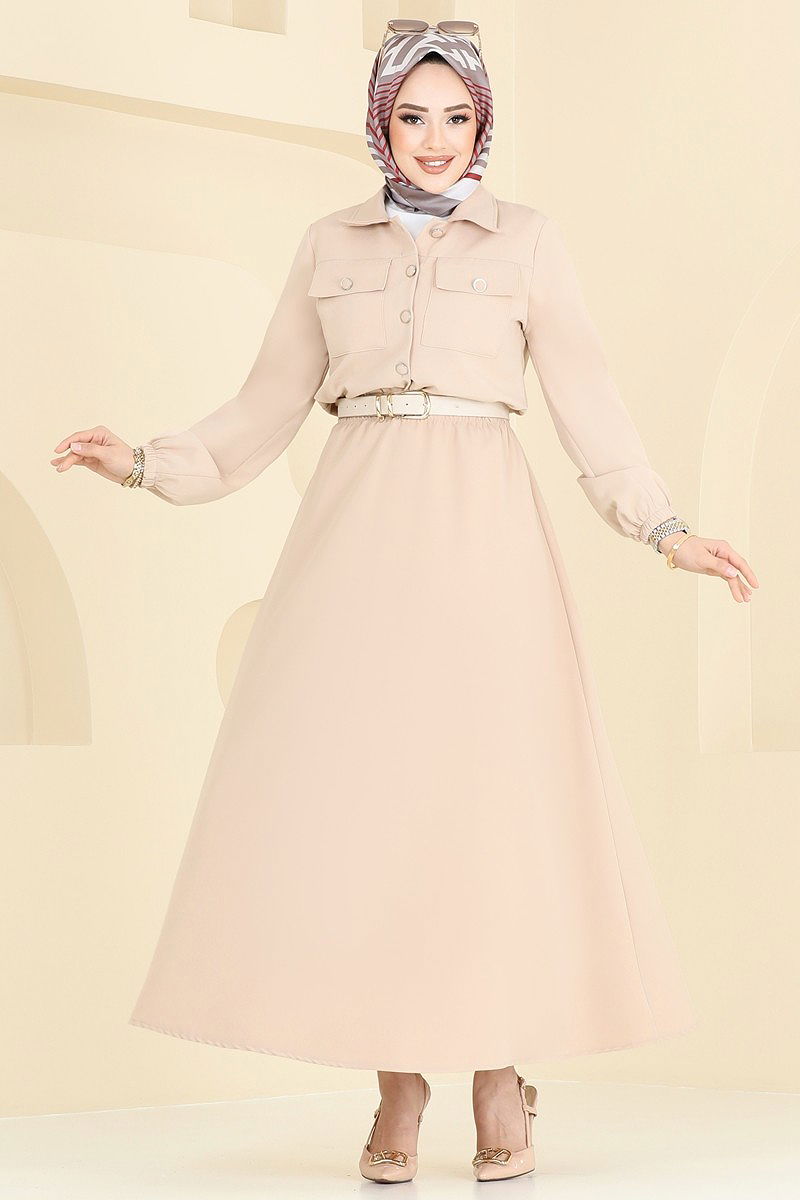 Product Feature : It is a new season hijab fashion product. The product has a Shirt collar. The product has From the front buttons. Unlined. Belt is not included. Shirt is not included. Sample combination is made with the shirt to show the intended use of the product. The chest pocket is active. The skirt waist is elastic. The cuff is rubberized. There may be a tonal difference in the product due to concept photo shoots.