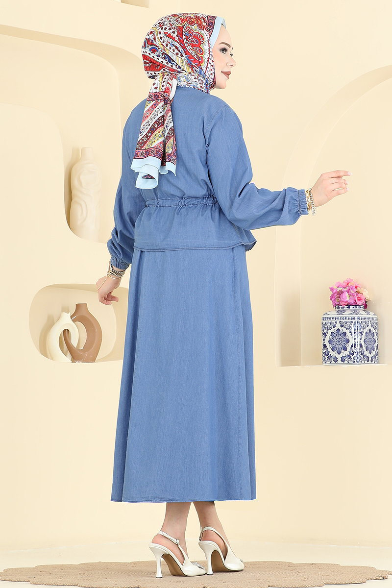 The Beli Tune Detailed Suit is a modern hijab combo that can be comfortably worn in all seasons. Suitable for gentle washing, this product can be washed at 30 degrees. Made from denim fabric, the product stands out with its high collar and front-buttoned design. The unlined combo's skirt waist and shirt cuffs are elasticated, offering extra comfort. The product also presents a modern look with its drawstring waist design. The product displayed is size 38, but different sizes are also available.