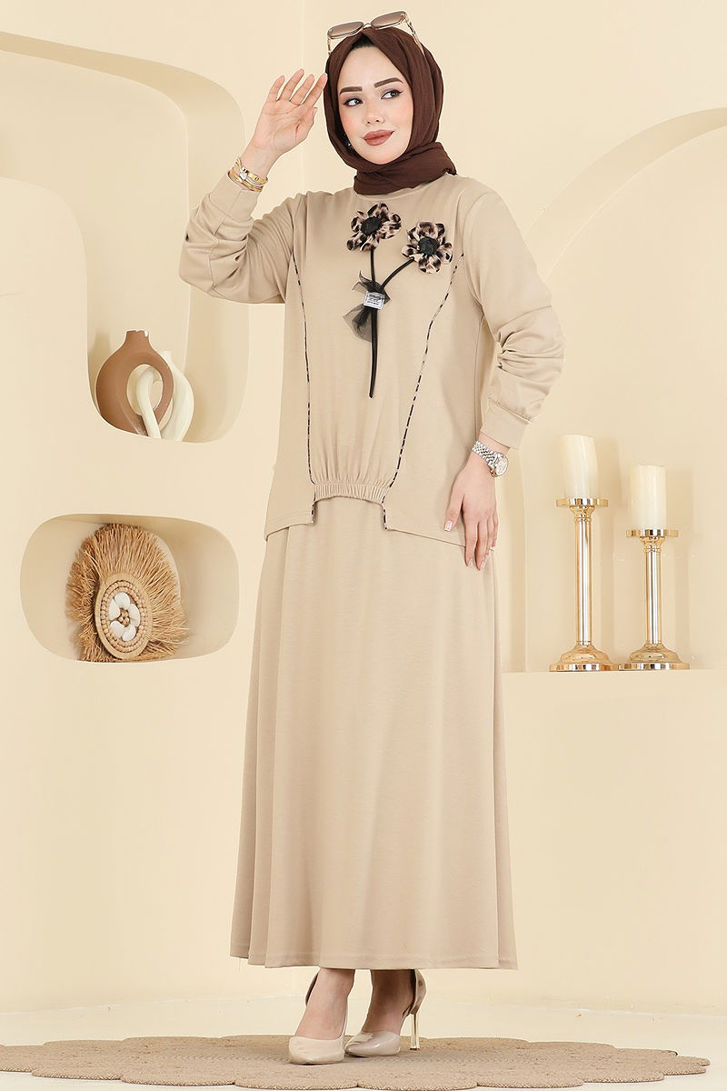 Leopard Floral 2-Piece KOMBIN is a hijab outfit suitable for all seasons. Made from modal fabric, this ensemble can be washed gently at 30 degrees. It features a crew neck and the waistband of the skirt is elastic, adding both comfort and elegance to the design. The built-in accessory and badge details enhance the garment's cohesion while the over-the-head feature offers convenience in wearing. Ideal for daily use, this set will become an essential in your wardrobe.
